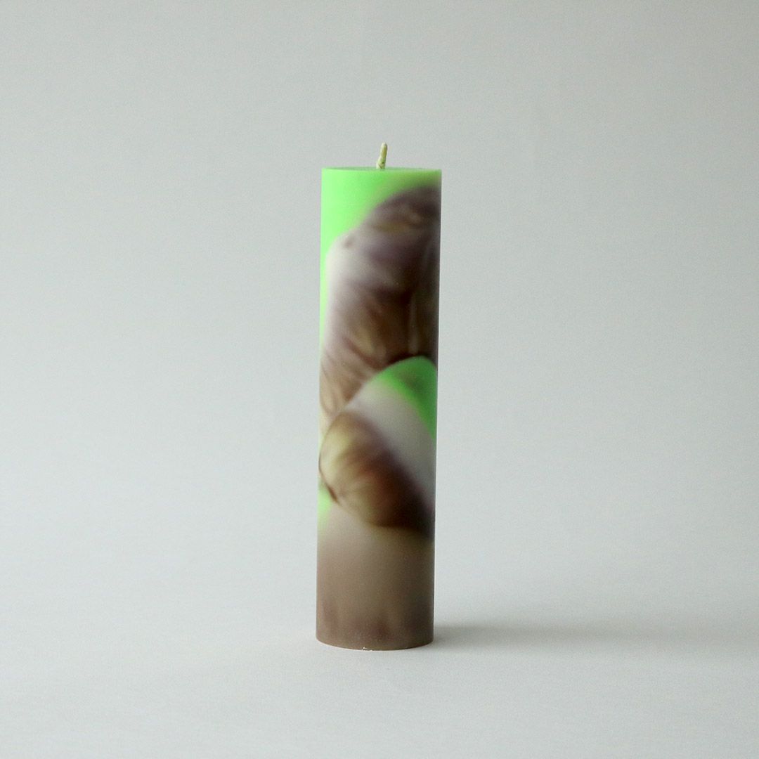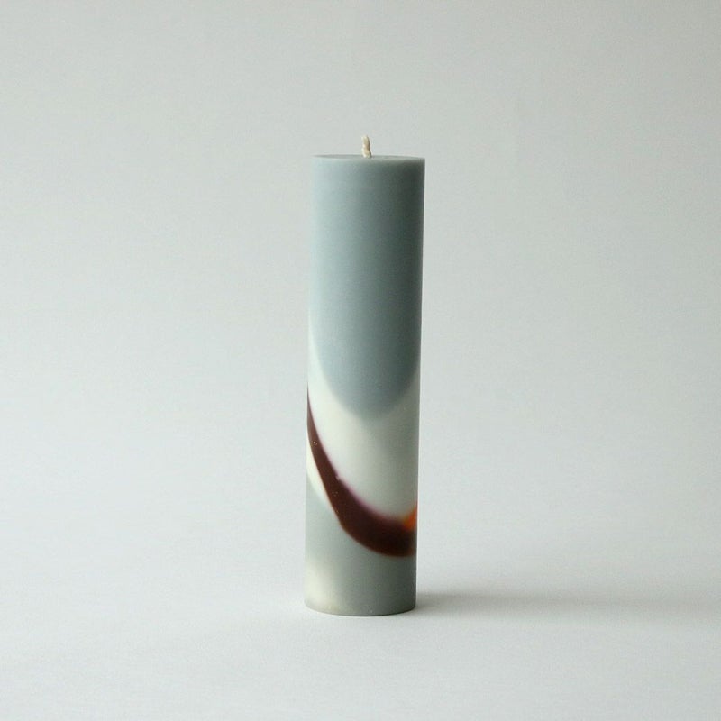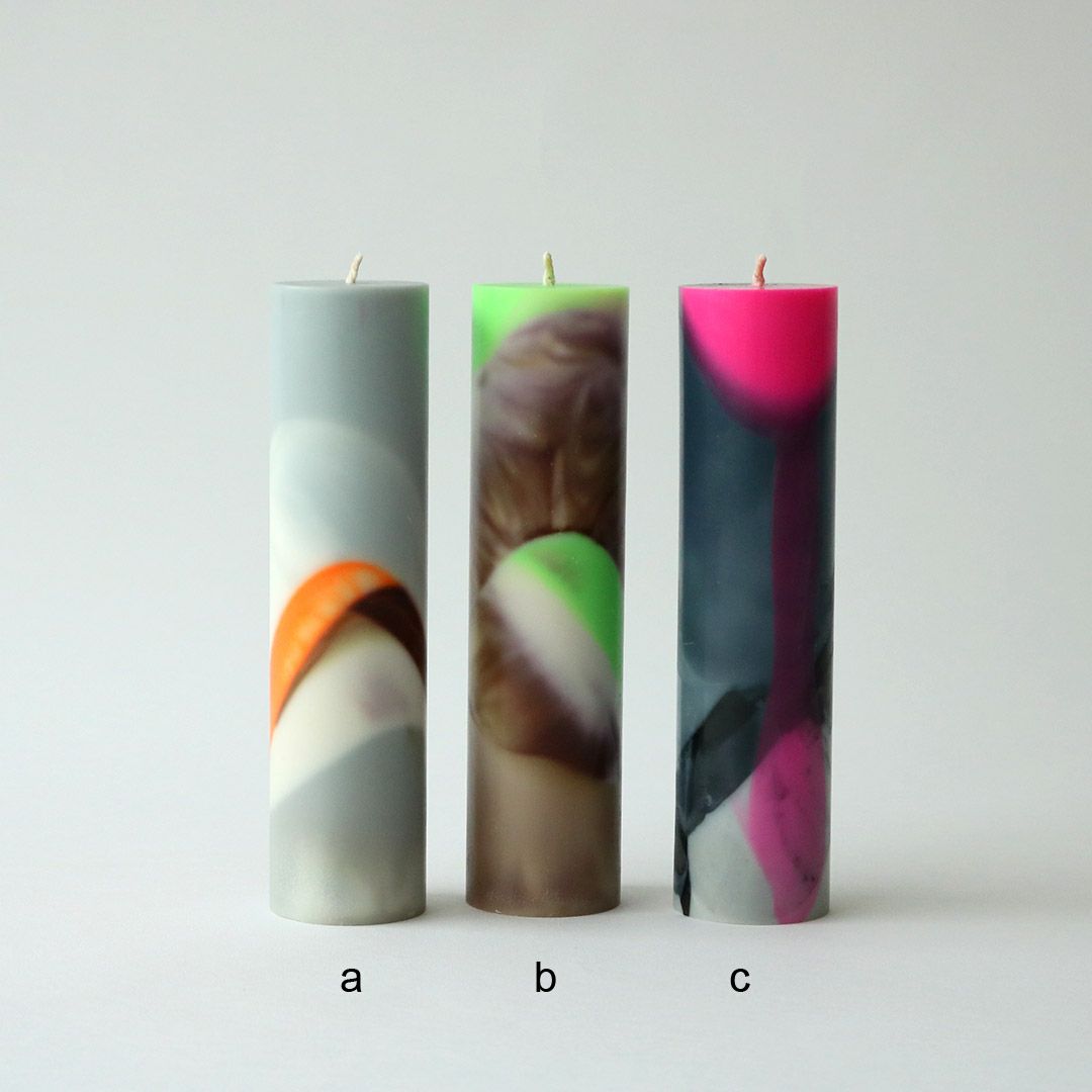 色の組み合わせが魅力的なc'èc'èキャンドル。ひとつふたつと置いてあるだけで存在感があり、オブジェとしてお部屋を彩ります。火を灯すとさまざまな色が混じり合い、その姿はアート作品のよう。