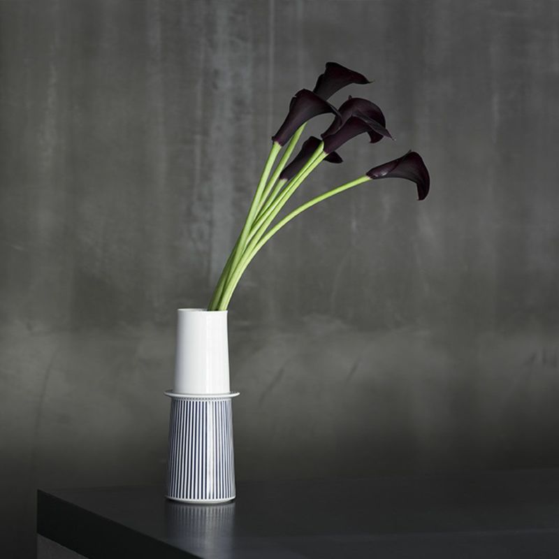強度のある高密度の陶土を用いた美しく艶のある白磁と、青のストライプのコントラストが、お花と共に空間を華やかに彩ります。