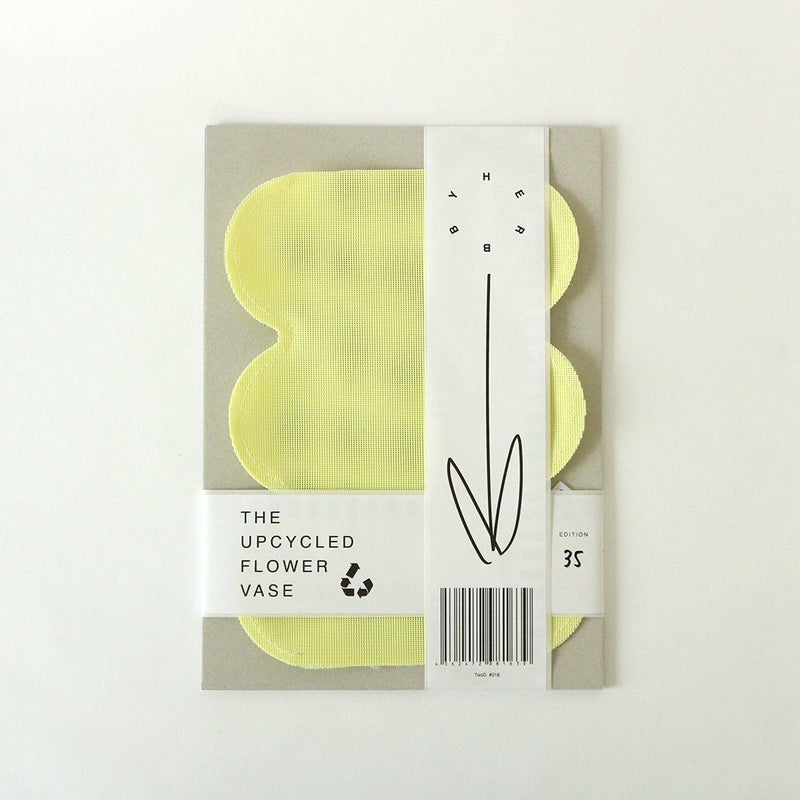 衣類のために生産され、過剰在庫やミスなどの理由で破棄処分されてしまう生地を利用した、アップサイクルフラワーベースです。日本のアトリエでひとつひとつ丁寧に手作りされています。