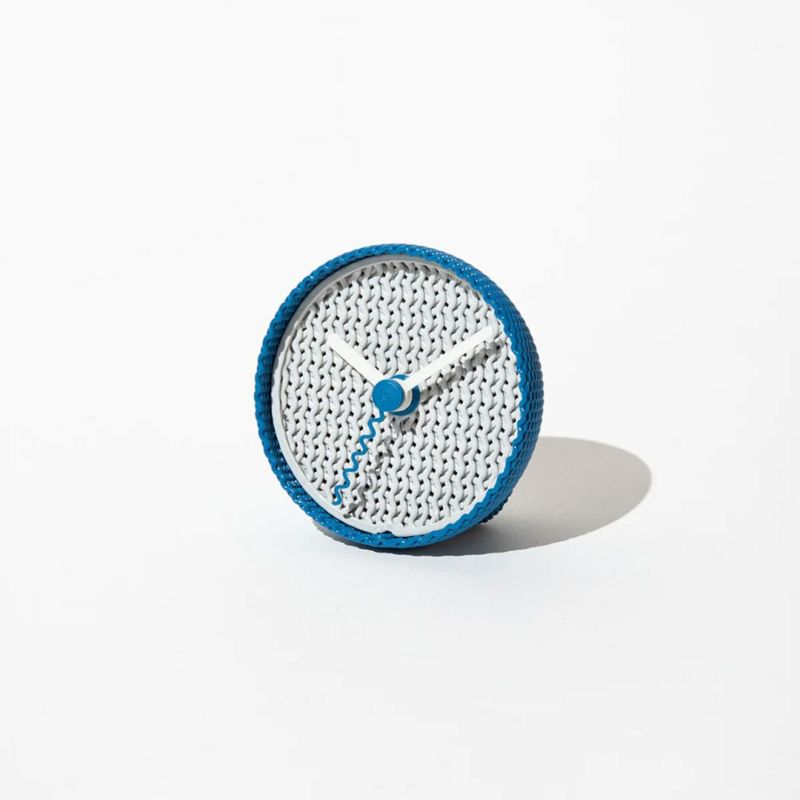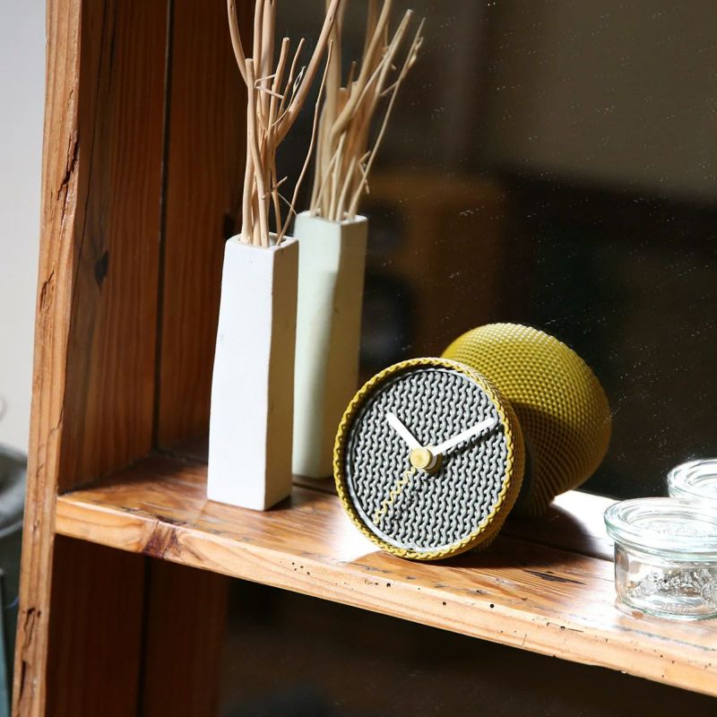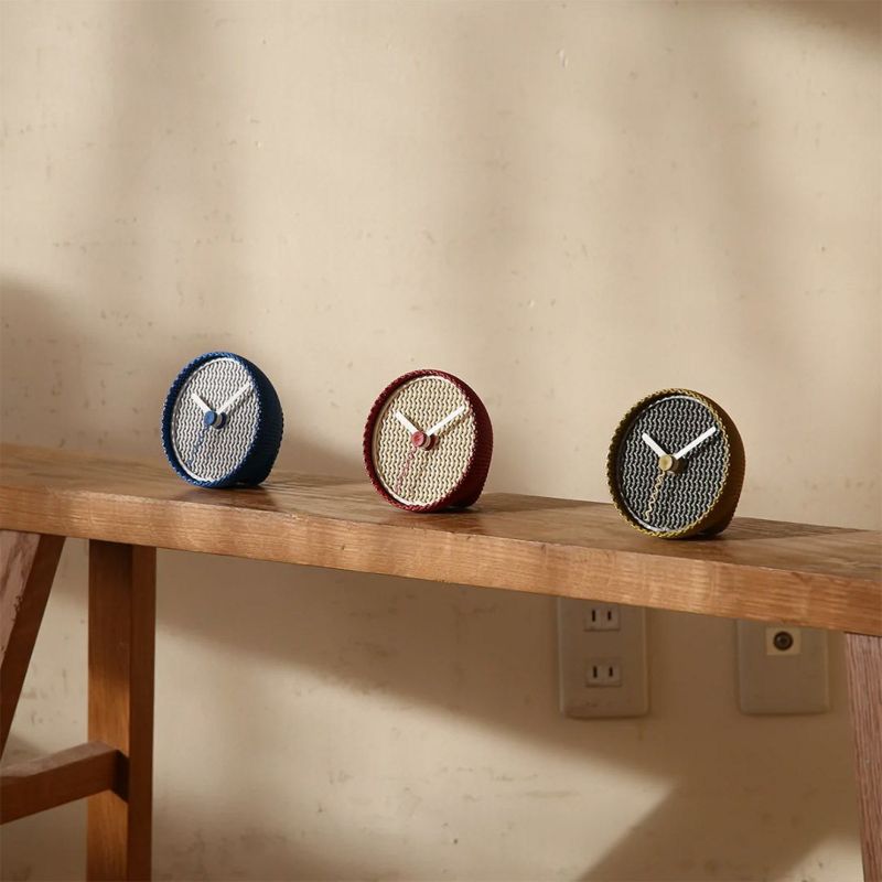 こちらは編みのテクスチャをボディに使った小さな置き時計です。文字盤を絶妙な角度で支える愛らしいフォルムは思わず手に取りたくなってしまいます。
