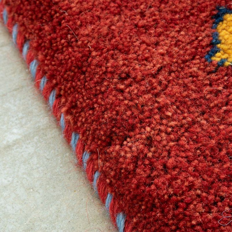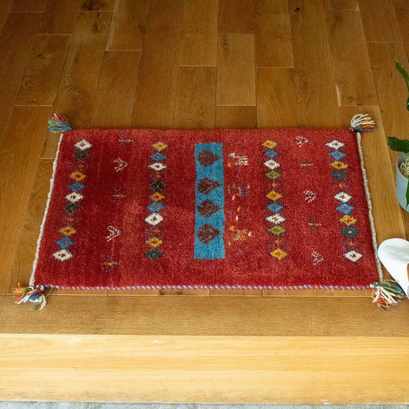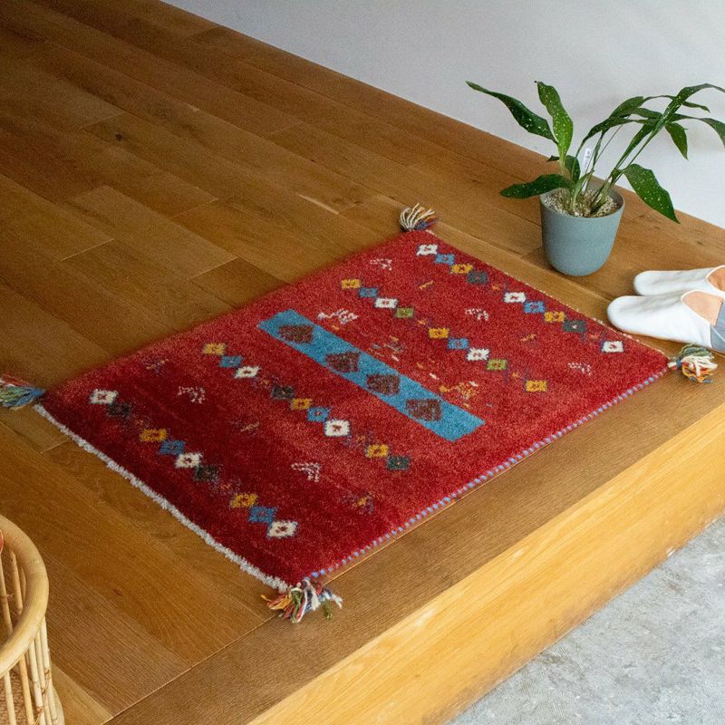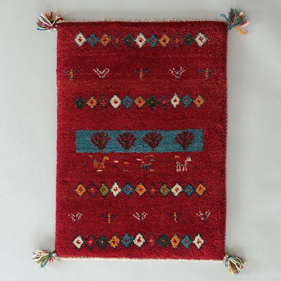 赤の中に連続する模様が織り込まれた可愛らしいギャッベ。ランダムなカラーのひし形も、不思議と全体に馴染んでいます。
