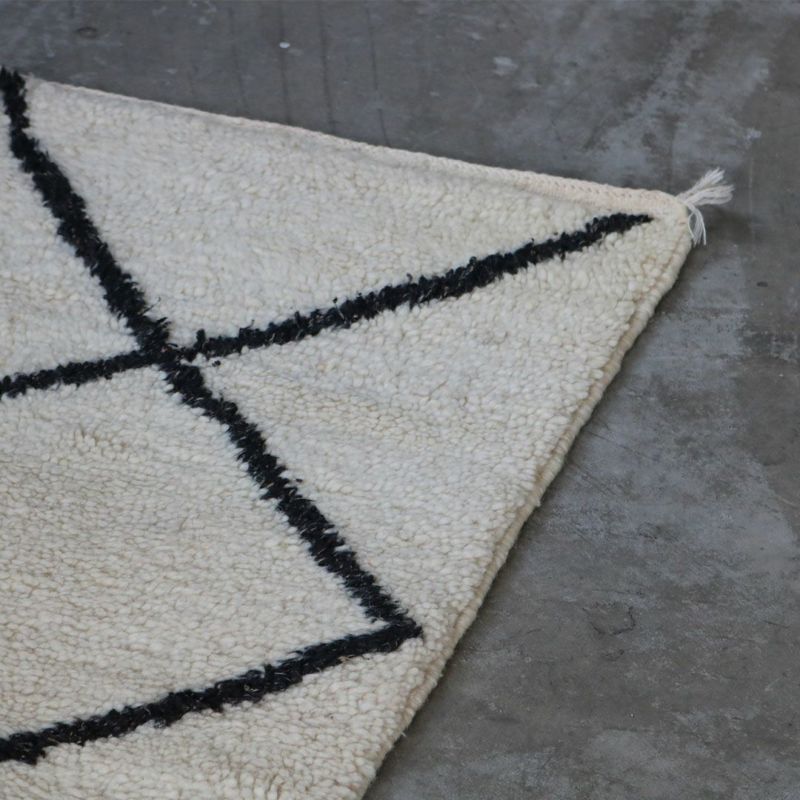 モロッコの先住民の多くは、高地の山岳地帯に羊とともに暮らす遊牧民で、その羊の毛を手織りしたラグを作り、テントの中で暮らしていました。今ではモロッコに20ほどのラグの産地があり、それぞれのラグに地名や部族の名前が付けられています。ベニワレンは、冬に雪が積もる山岳地帯のベニワレン地方で織られています。モロッコのラグの中でも最も名前が知られているラグのひとつです。
