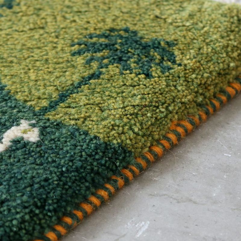 こちらは通称「チェアマット」ととも呼ばれる、椅子の座面にぴったりの座布団サイズ。緑の広大な大地に描かれているのは、3本のヤシの木と3頭のラクダ。手仕事を感じる風合い、どこか温かく懐かしい雰囲気のギャッベは、どんなインテリアにも合わせやすい万能のアイテムです。