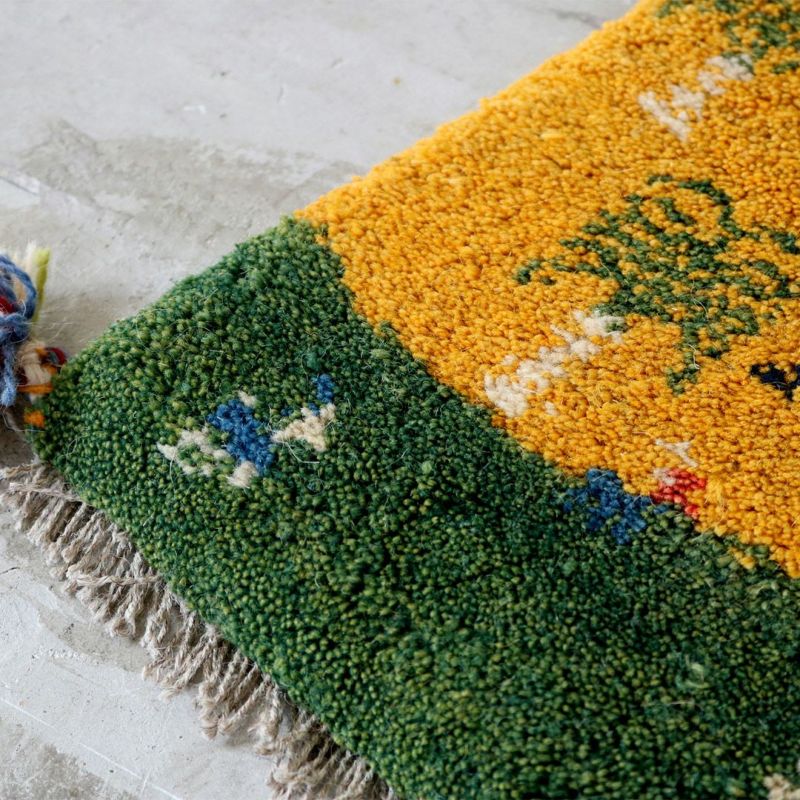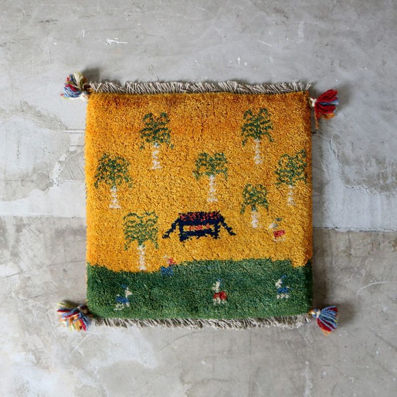 遊牧民の暮らしの道具として育まれてきた「ギャッベ」。飼っている羊の毛を刈り、糸を紡ぎ、織りあげるという手法は、今も大切な文化として受け継がれており、同じものが存在しない世界にひとつの絨毯です。こちらは通称「チェアマット」ととも呼ばれる、椅子の座面にぴったりの座布団サイズ。夕日を思い出させる暖かな黄色に描かれているのは、ヤシの木と遊牧民のテントでしょうか。手仕事を感じる風合い、どこか温かく懐かしい雰囲気のギャッベは、どんなインテリアにも合わせやすい万能のアイテムです。