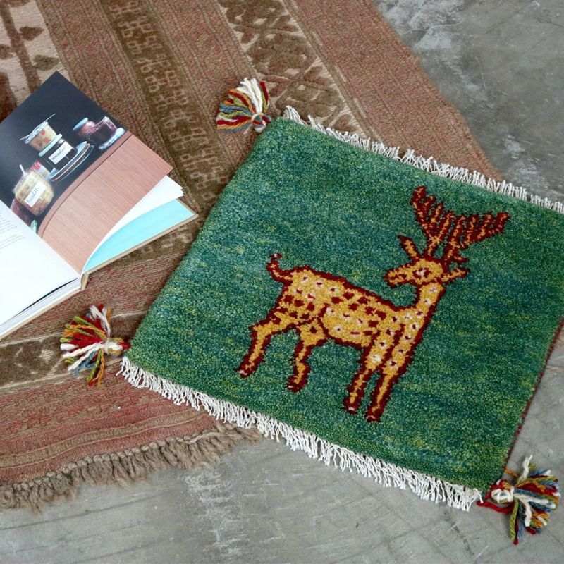 遊牧民の暮らしの道具として育まれてきた「ギャッベ」。飼っている羊の毛を刈り、糸を紡ぎ、織りあげるという手法は、今も大切な文化として受け継がれており、同じものが存在しない世界にひとつの絨毯です。こちらは通称「チェアマット」ととも呼ばれる、椅子の座面にぴったりの座布団サイズ。鮮やかなグリーンを下地に描かれているのは、遊牧生活の中で目にするシカ。手仕事を感じる風合い、どこか温かく懐かしい雰囲気のギャッベは、どんなインテリアにも合わせやすい万能のアイテムです。