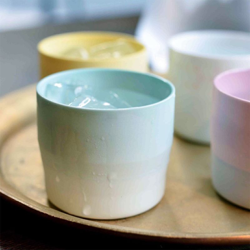 日本の伝統色である、淡く、果敢ない色の層を重ねながら、陶磁器という文脈の中で再解釈したテーブルウェアのシリーズは、現代的で非常に機能性の高い形の中に、有田の特有の色遣いが反映されています。