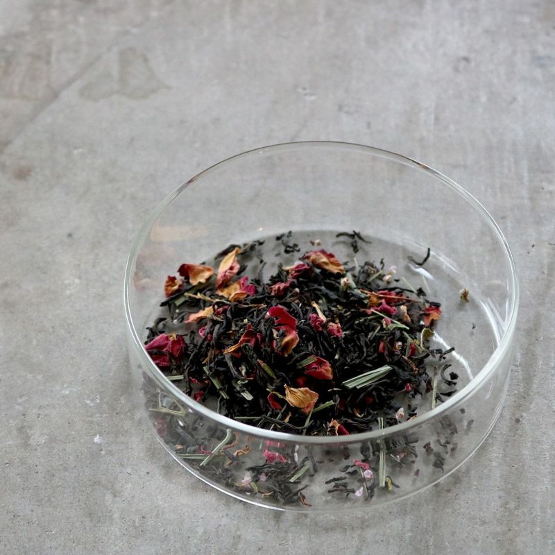 中国紅茶であり、世界三大紅茶のひとつでもあるキームン紅茶。蘭の花のような甘い香りと、スモーキーな香りが特徴です。そこに季節の花、ローズとピンクの小さな小花ヒース、そしてレモングラスをブレンドしました。茶葉の中に赤やピンクのお花がたくさん入っていて、見た目にもとっても華やか。お湯を注ぐとお花がふわりと泳ぎます。