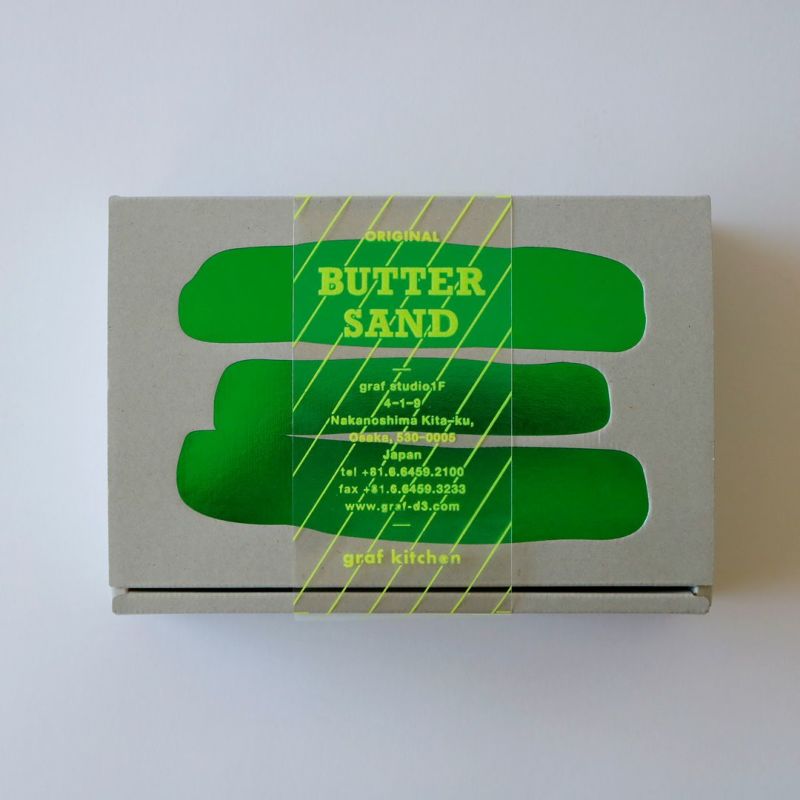 6種のバターサンドが入っているパッケージは、グリーンの箔押しがキラリ。誰かに贈りたくなるような、目を引くパッケージにもこだわりを詰め込みました。ぜひギフトにもご利用ください。