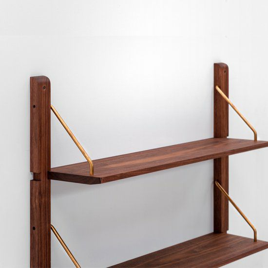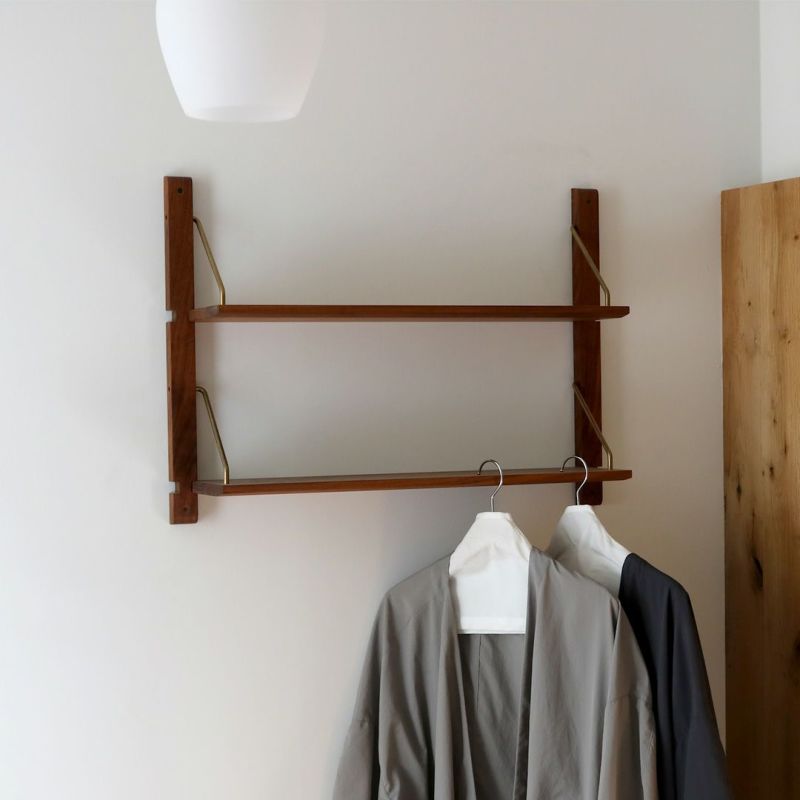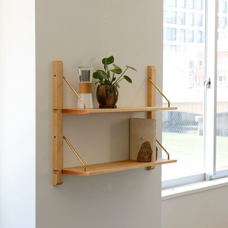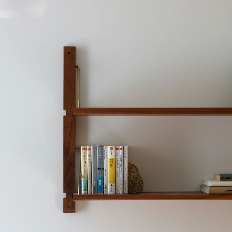 棚受支柱が2本、真鍮アームが4本、棚板2枚(幅70cm奥行き18cm)が1セットになった取付棚です。小ぶりですが、壁面にネジで固定するため丈夫で、本やオブジェなどお気に入りを並べるためのスペース、店舗ディスプレイ棚として、様々なアイデアで壁面の空いたスペースを有効活用いただけます。