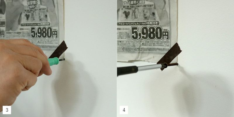 3.紙の4つの角がネジを打ち込む位置になります。4箇所全てにピンやきりで穴を空けます。ここで下地があるかどうかを確認します。ピンが最後まで刺されば下地なし(→アンカーが必要)、ピンが途中で止まって先が少しだけ刺さる感触の場合は下地があります。(→アンカーは不要)