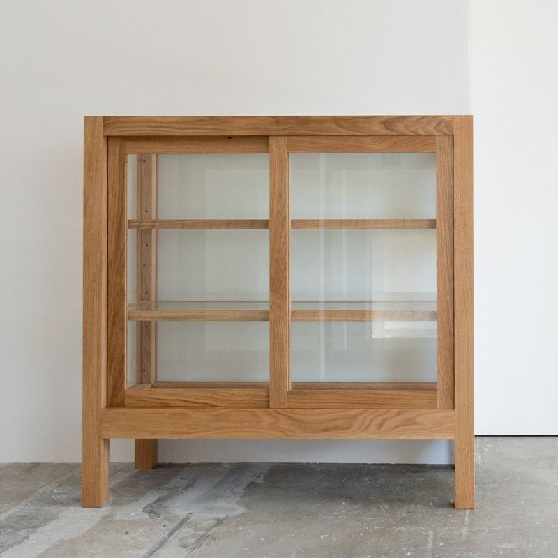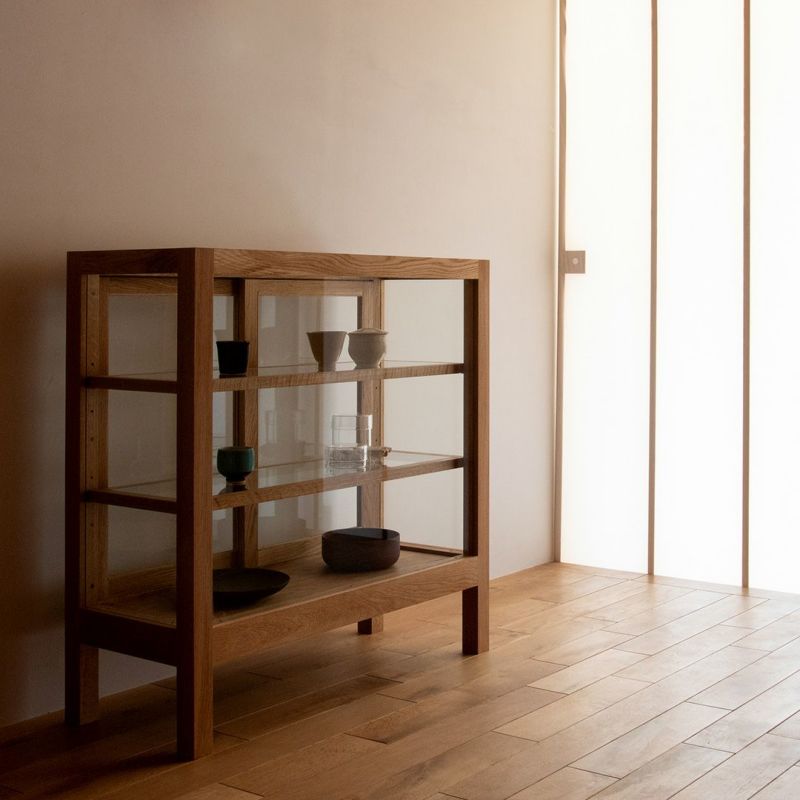 天面と4面がガラスの木枠で組んだシンプルなショーケースは、お気に入りの器や大事につかっている道具、旅先から持ち帰ったものなど、大切なもの(思い出も)が主役となるためのスペースです。眺めること、モノと向き合うことで育まれる心のゆとりや豊かな気持ちになれる時間のある暮らしの提案です。