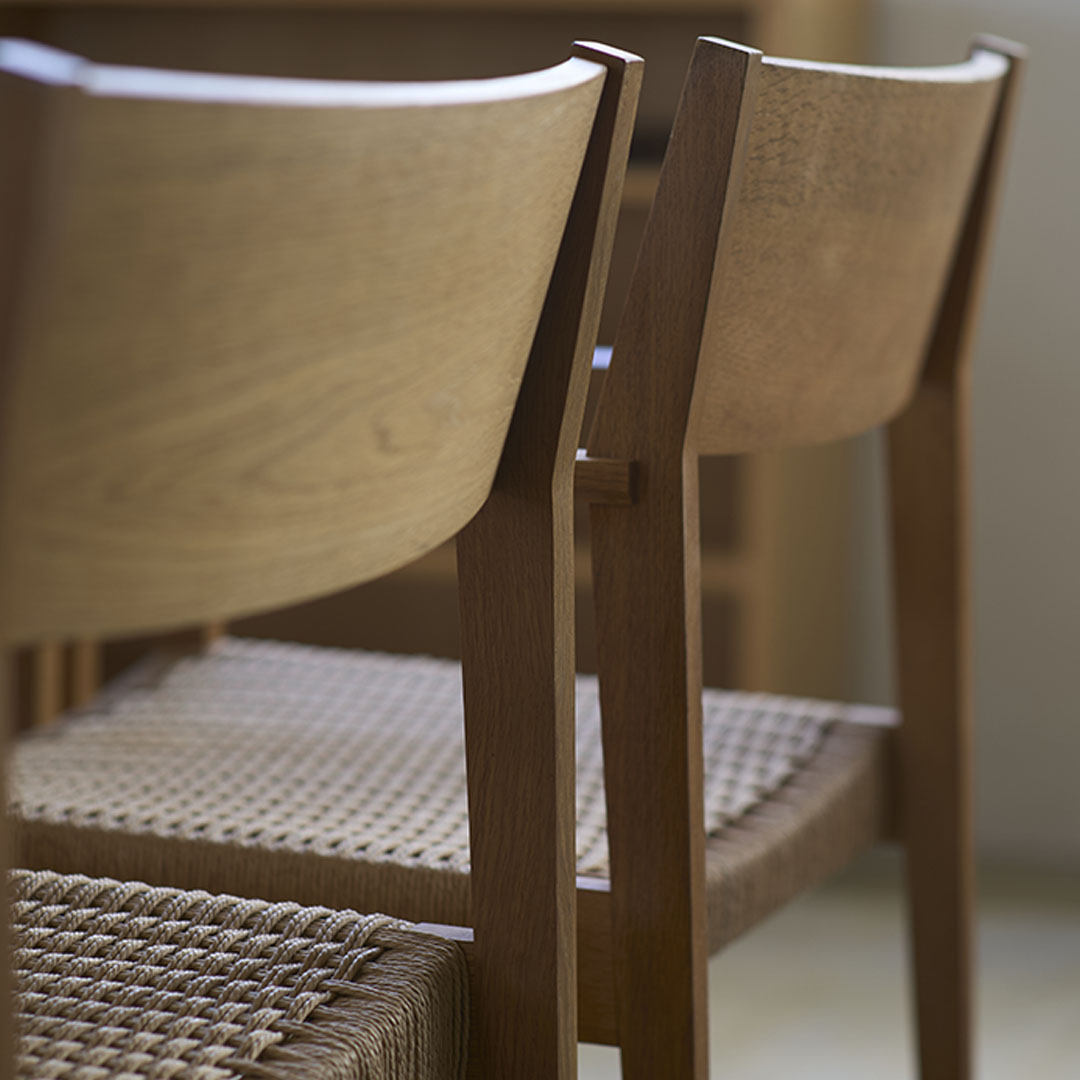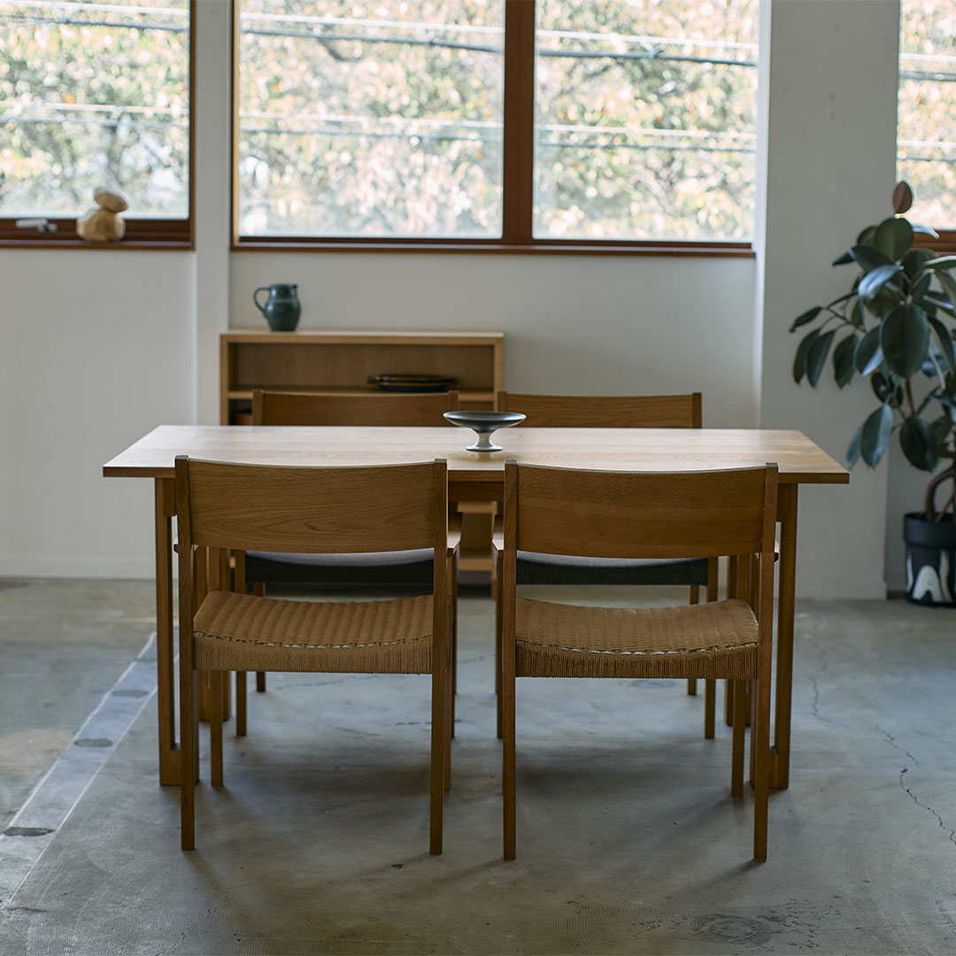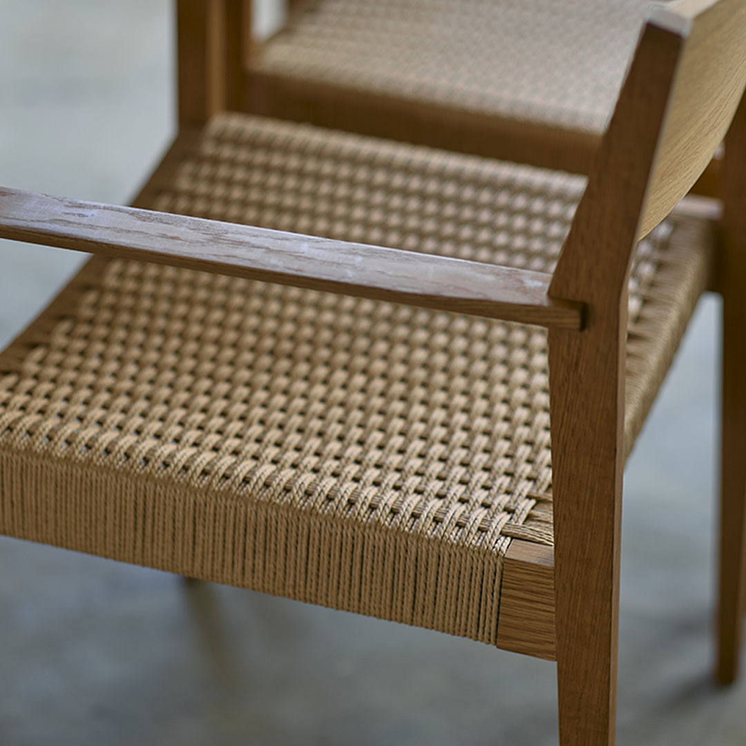 ホワイトオーク材を用いたストレートのラインが細くしなやかで、落ち着いた雰囲気のアームチェアのペーパーコード編みです。1脚でも十分な存在感が感じられます。