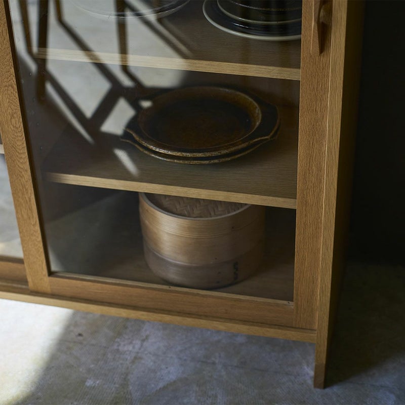 見せる収納の楽しさが広がる下のガラス戸は、お気に入りの器や本、旅先で集めたものたちを並べて、小さなギャラリーのようにも使えます。