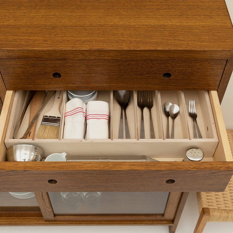 上部には4つの抽斗があり、文房具やリモコン、カトラリーなどのキッチン用品や、こまごました日用品などをすっと整理することができます。