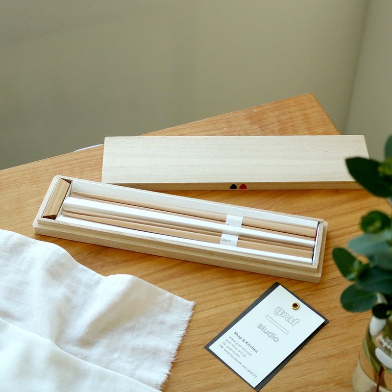 また、grafの三角箸は栗の他にマラスとブナも販売しており、それぞれの木の持つ表情を、お好みによりお選びいただけます。ギフトセットや単品とバリエーション豊富にご用意しております。
