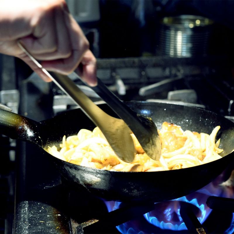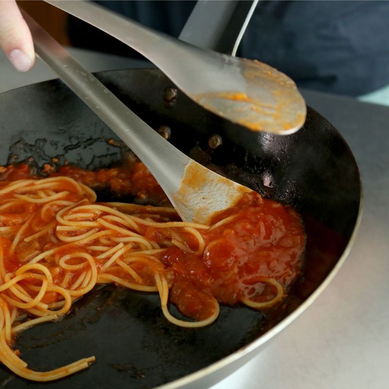 先がぴったりと合うように設計しているので、細かいものもつかみやすいです。炒め物の際は、トング先を利用して食材を切り分けることもできます。