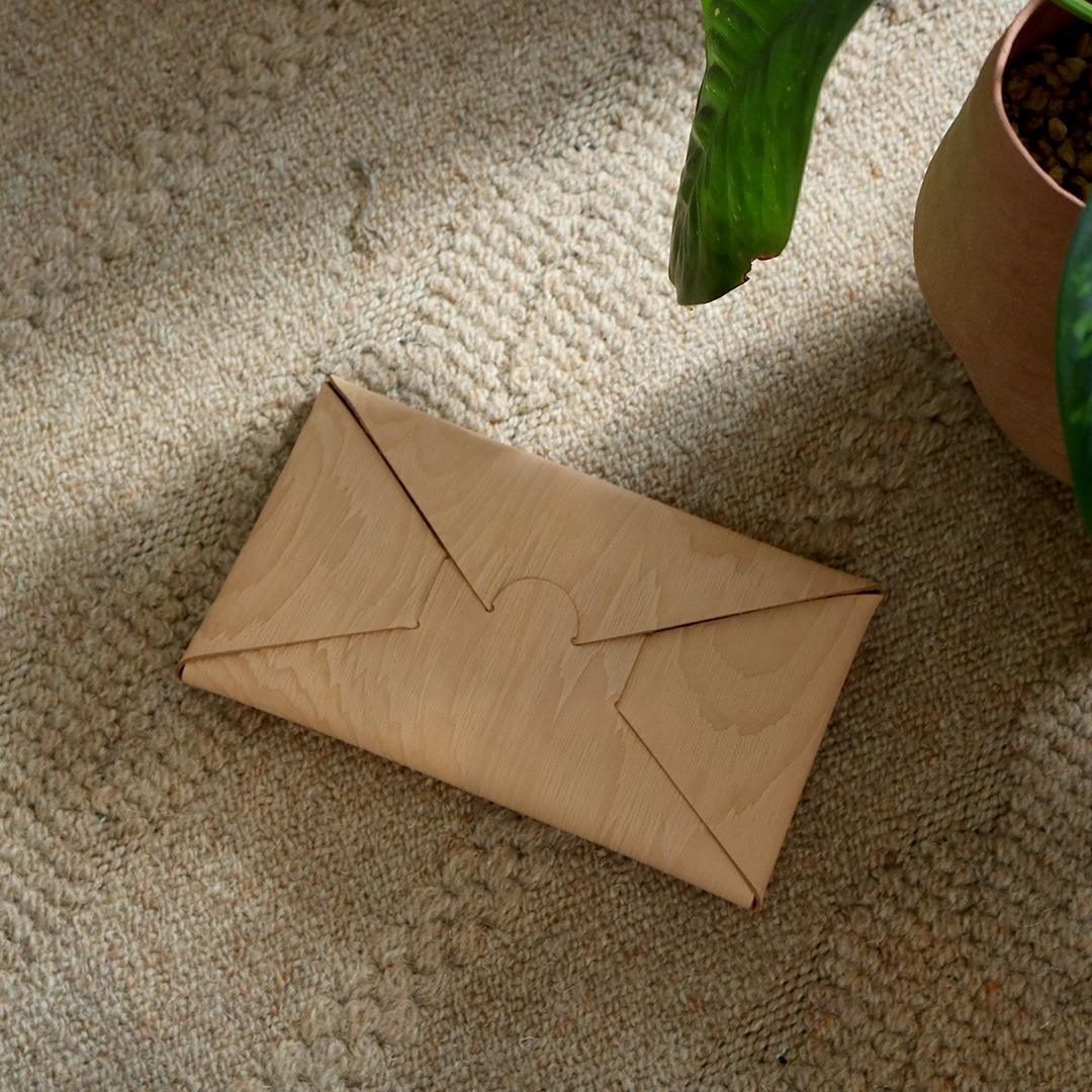 きめの細かいキップのタンニン革に木目の型押しを施したオリジナルレザー。革の裁断する部分によって木目の表情が異なるため、ひとつとして同じものはありません。
