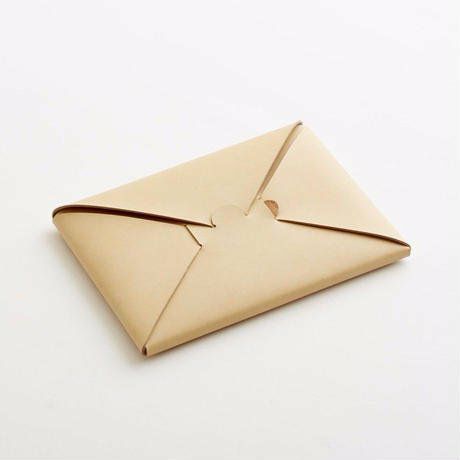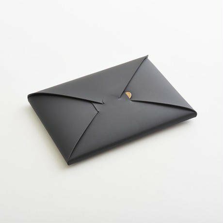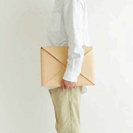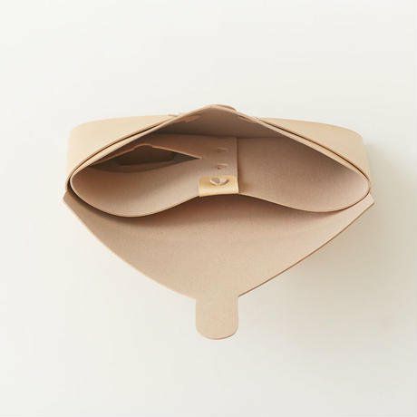 一枚のパーツを縫製せずに折り込んで組み立てたシンプルな構造のクラッチバッグ。