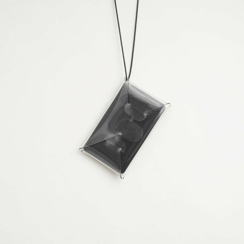 本体は1mm厚の透明PVC、中仕切りは牛革を使用。