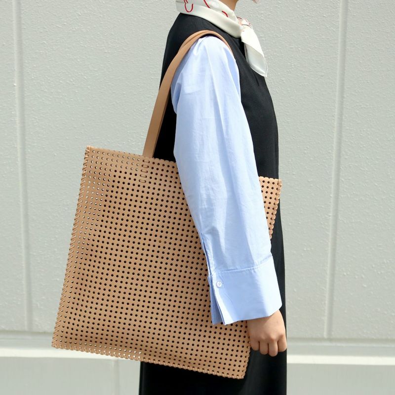 パンチング加工が施されているため、軽いのが特徴です。通常のレザーバッグの2/3程度の重さになっています。