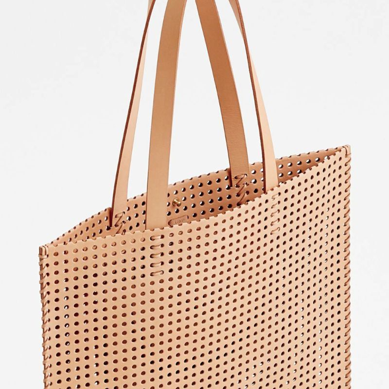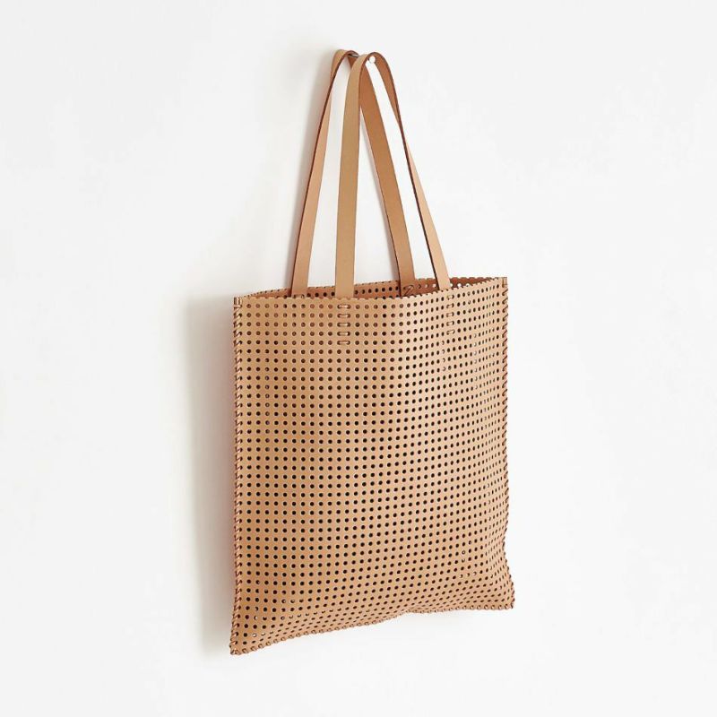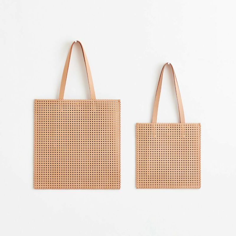 籠細工から着想を得た"KAGO"シリーズのフラットバッグ。普遍的に使えるような形にするために、いろいろな民芸のカゴを参考に試作を重ねて完成しました。