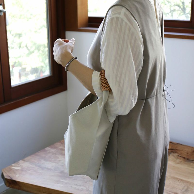 本体はしっかりとした厚みとハリ感がある、16ozのコットンキャンバス。マチが充分にあり容量もたっぷり入りますが、丈夫でタフな素材なのでシルエットもキープしてくれます。レザーハンドルは、取り外し可能でキャンバス部分のクリーニングが簡単にできるのも嬉しいポイント。