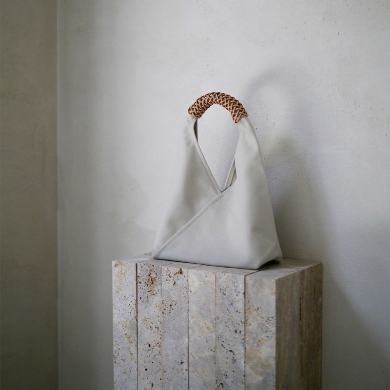 キャンバスのトライアングル型は、台湾の東海岸で米を運ぶために使用されていたあずま袋からインスピレーションを得ているそう。着物の前合わせのように重なり合ったデザインがクラシカルで美しく、どこか日本的な佇まいも感じられます。