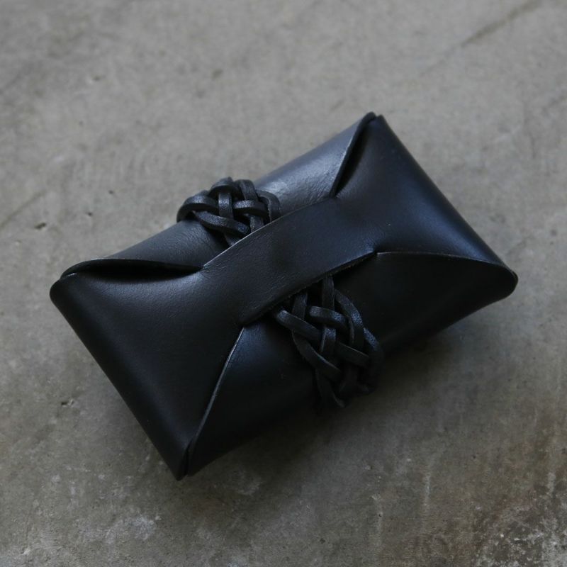 折紙に着想して設計されたシンプルな一枚革のケースに、革を細かく編み込んだ帯のようなリングで蓋をホールドする形状。編み込みは、アミ族の伝統的な織物技術からインスパイアされ作られています。