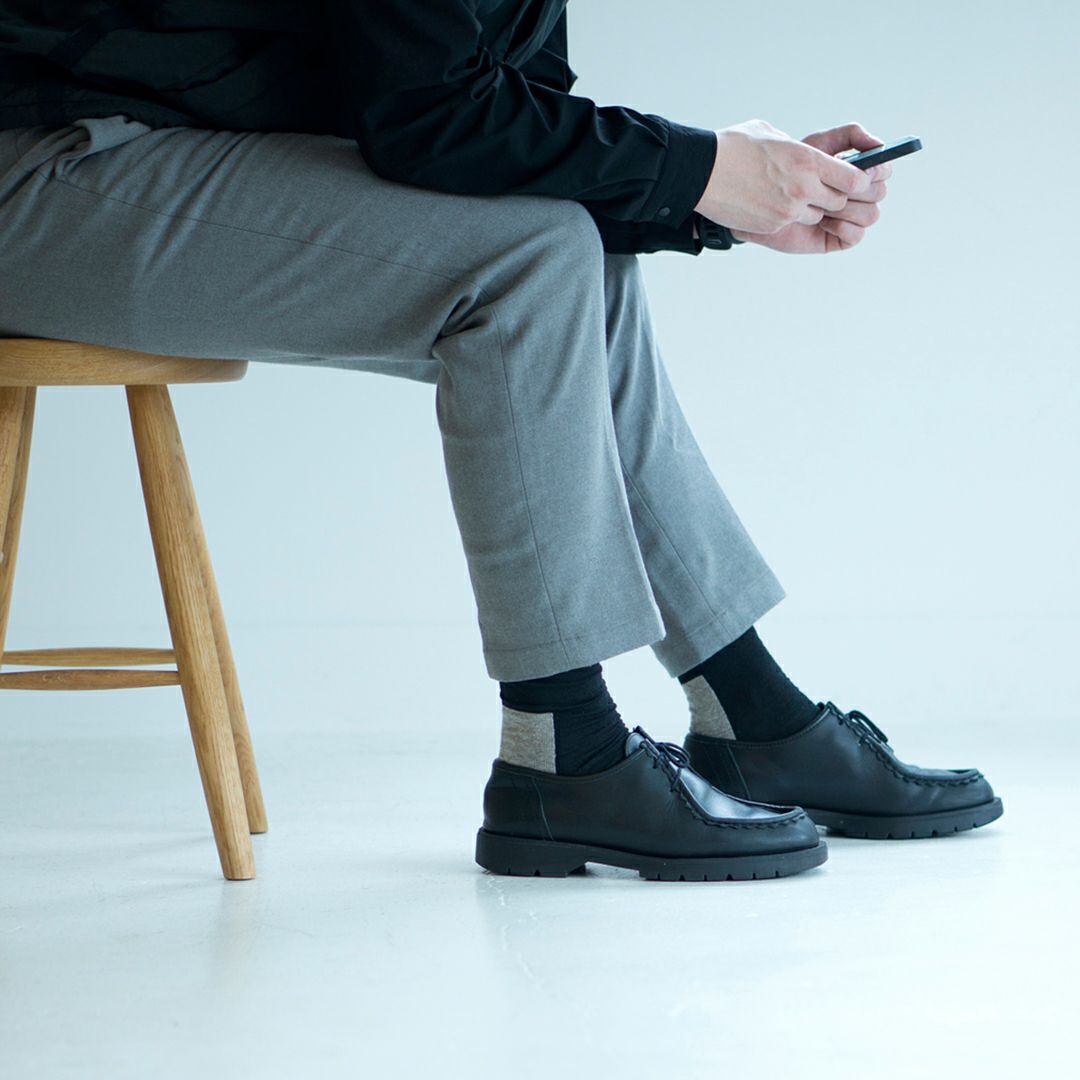 靴から少し覗く、踵の切り替えの配色がポイントです。スーツスタイルのワンポイントに、スニーカーと合わせてカジュアルに楽しむのも素敵。オンオフ問わずに活躍してくれる靴下です。