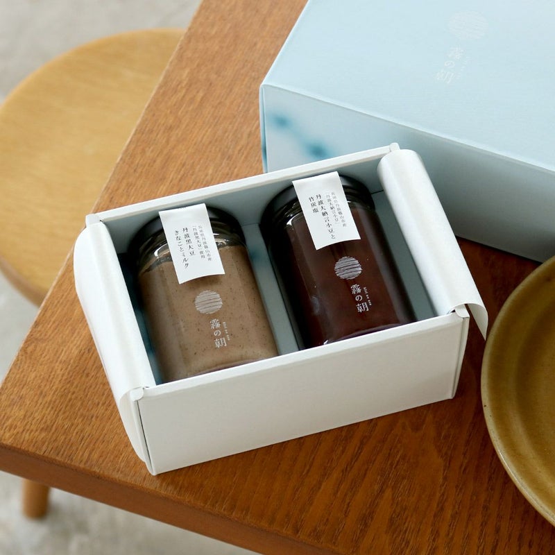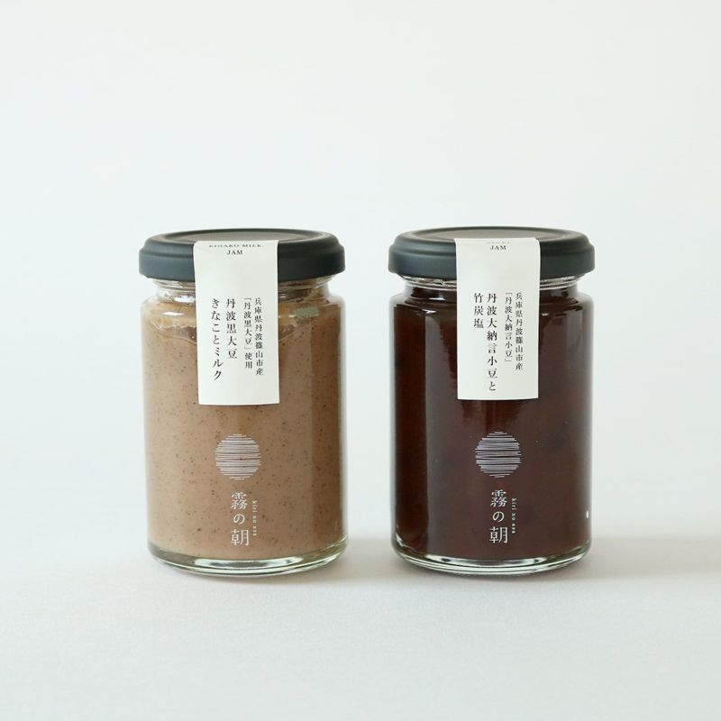 こちらは兵庫県丹波篠山市産「丹波黒大豆」のみでつくったきなこを、国産生乳を使用した濃厚でコクのあるミルクジャムと合わせた黒豆きなこミルクジャムと、兵庫県丹波篠山市産の「丹波大納言小豆」を風味豊かに炊き上げ、竹のミネラルが染み込んだ竹炭塩と合わせた小豆ジャムのセットです。