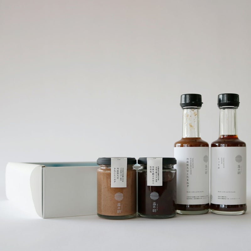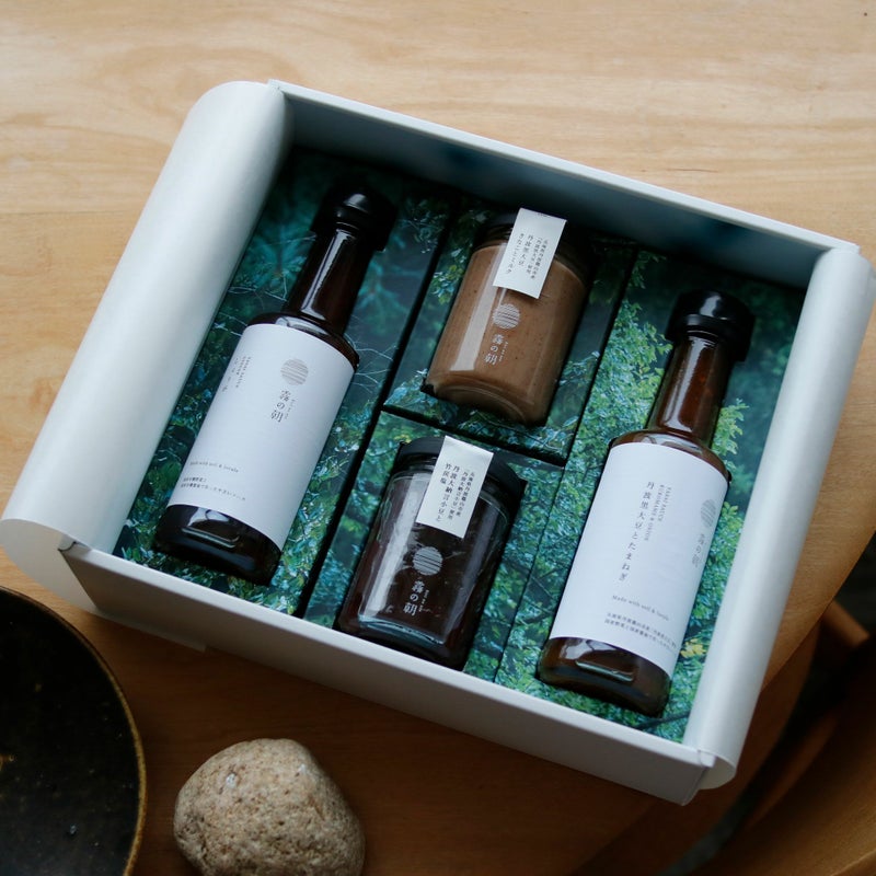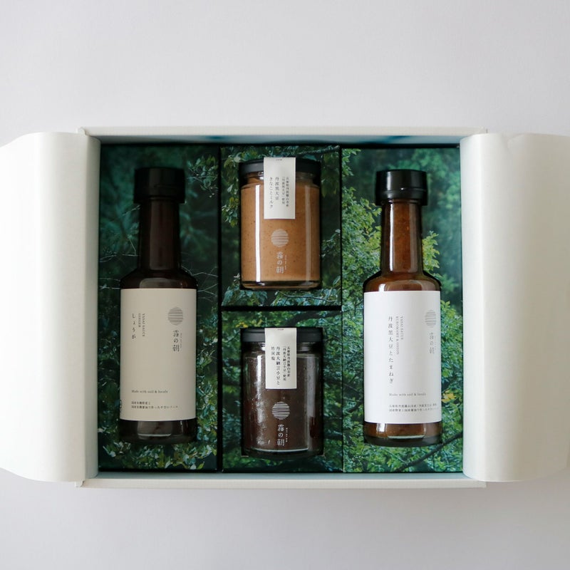 兵庫県と京都府にまたがる丹波地方で、無添加ジャムや野菜ソースなどを生産する霧の朝から、ギフトセットの提案です。こちらは、「丹波黒大豆とたまねぎ」と「しょうが」の野菜ソース、「丹波黒きなことミルク」と「丹波大納言小豆と竹炭塩」の詰め合わせです。