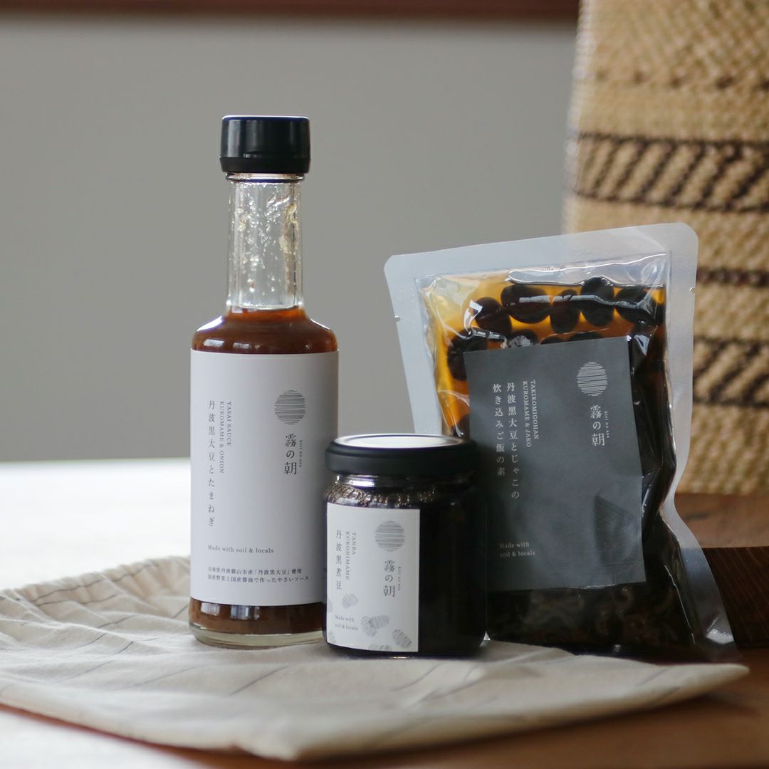 兵庫県と京都府にまたがる丹波地方で、無添加ジャムや野菜ソースなどを生産する霧の朝から、ギフトセットの提案です。こちらは、「丹波黒煮豆」と「野菜ソース 丹波黒大豆とたまねぎ」と「炊き込みご飯の素 黒豆とじゃこ」の巾着セットです。商品を巾着袋にお詰めしてお届けします。