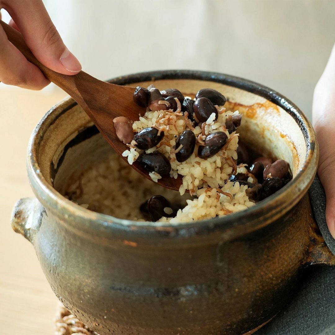 丁寧にひかれた自家製だしをベースに、大粒の丹波黒大豆と上質なちりめんじゃこをたっぷりと使用した食べごたえのある贅沢な炊き込みご飯の素。