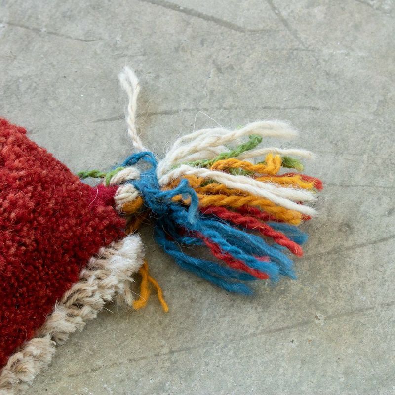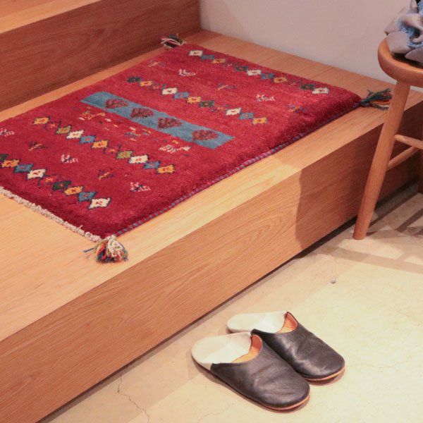 赤の中に連続する模様が織り込まれた可愛らしいギャッベ。ランダムなカラーのひし形も、不思議と全体に馴染んでいます。
