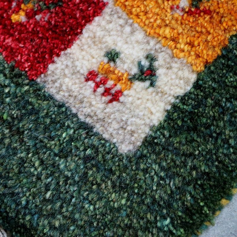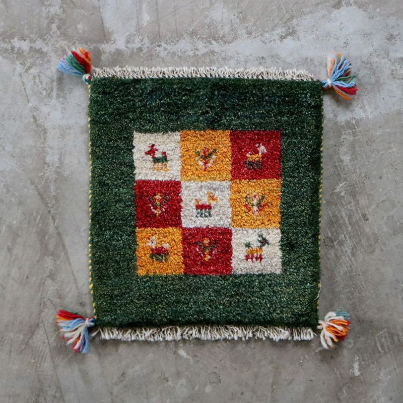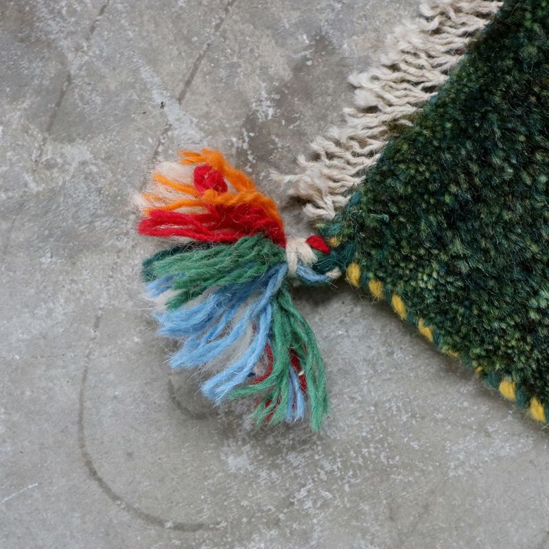 少し渋めのグリーンを基調とした、落ちいたカラーリングのギャッベ。遊牧民の暮らしには欠かすことのできない大切な存在、山羊が丁寧に配置されています。和室にも合わせたくなるデザインです。