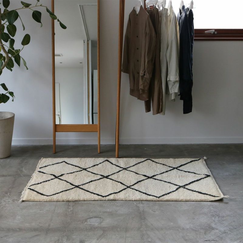 天然の羊毛本来のアイボリーを基調とした、ベニワレンの最もポピュラーな配色の一枚。柔らかなアイボリーの色味はインテリアのテイストを選ばず、お部屋に取り入れやすいのがいいところ。サイズはW149×H100cmほどで、玄関やベッドサイド、サイドテーブルの下などに取り入れやすいサイズ感です。