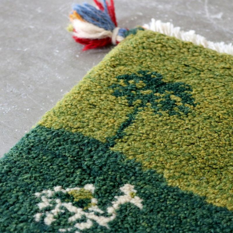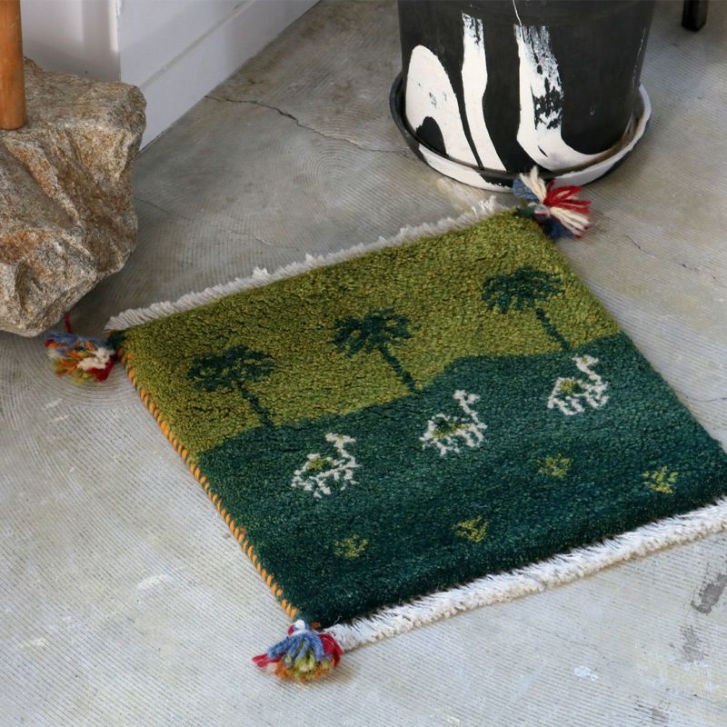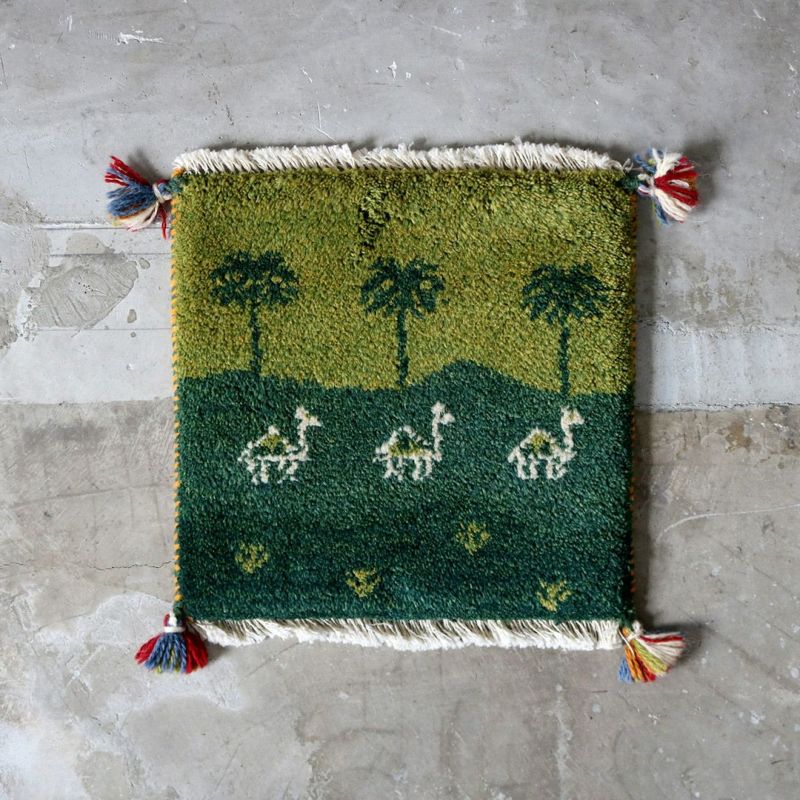 こちらは通称「チェアマット」ととも呼ばれる、椅子の座面にぴったりの座布団サイズ。緑の広大な大地に描かれているのは、3本のヤシの木と3頭のラクダ。手仕事を感じる風合い、どこか温かく懐かしい雰囲気のギャッベは、どんなインテリアにも合わせやすい万能のアイテムです。
