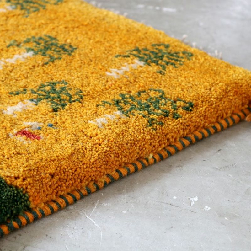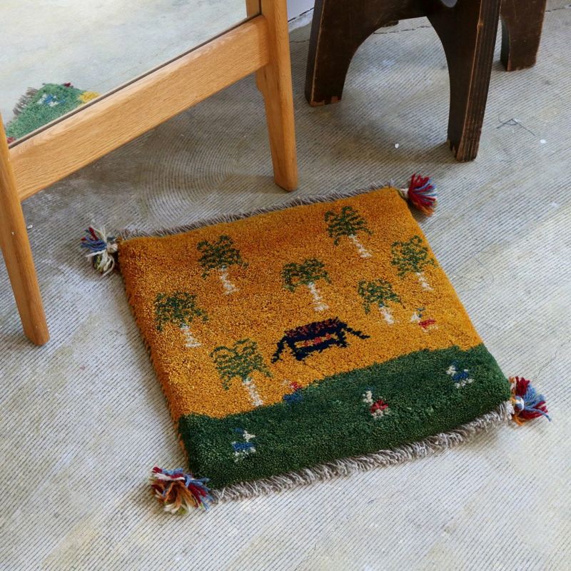遊牧民の暮らしの道具として育まれてきた「ギャッベ」。飼っている羊の毛を刈り、糸を紡ぎ、織りあげるという手法は、今も大切な文化として受け継がれており、同じものが存在しない世界にひとつの絨毯です。こちらは通称「チェアマット」ととも呼ばれる、椅子の座面にぴったりの座布団サイズ。夕日を思い出させる暖かな黄色に描かれているのは、ヤシの木と遊牧民のテントでしょうか。手仕事を感じる風合い、どこか温かく懐かしい雰囲気のギャッベは、どんなインテリアにも合わせやすい万能のアイテムです。