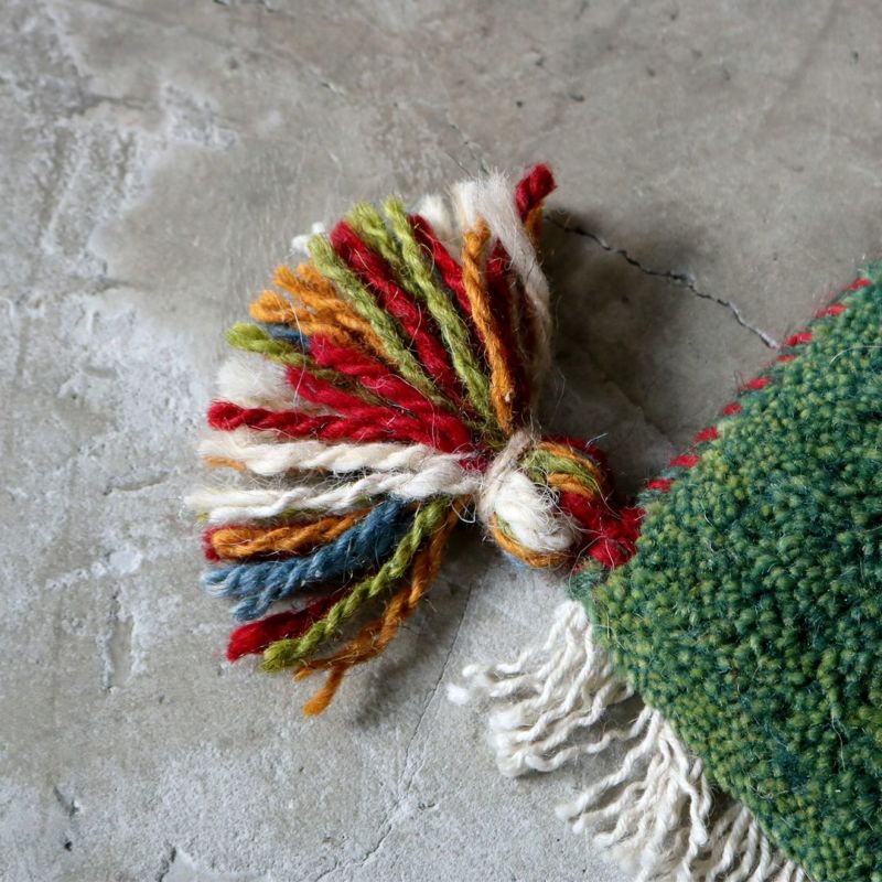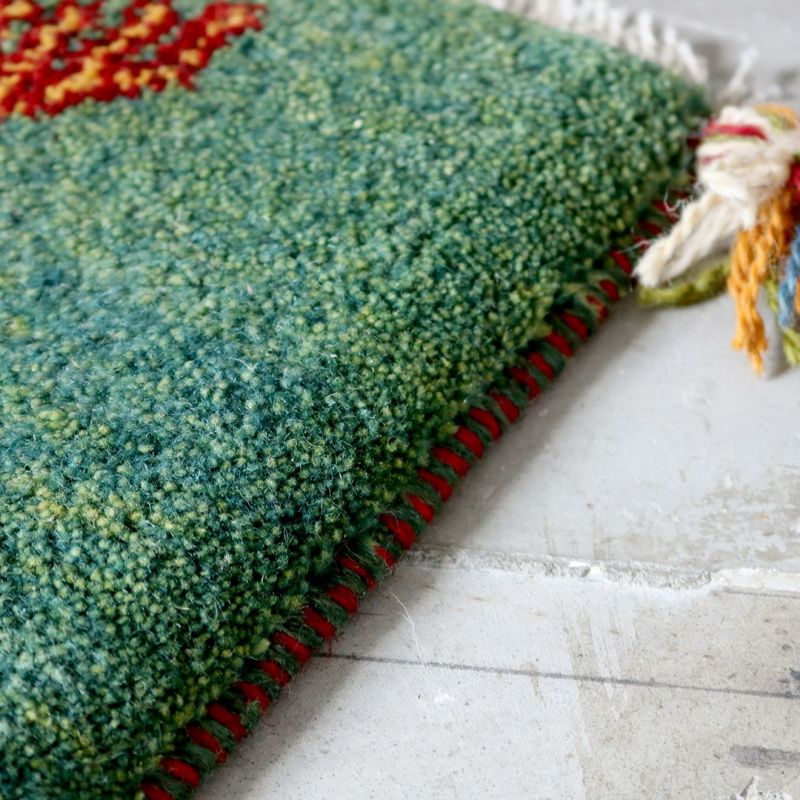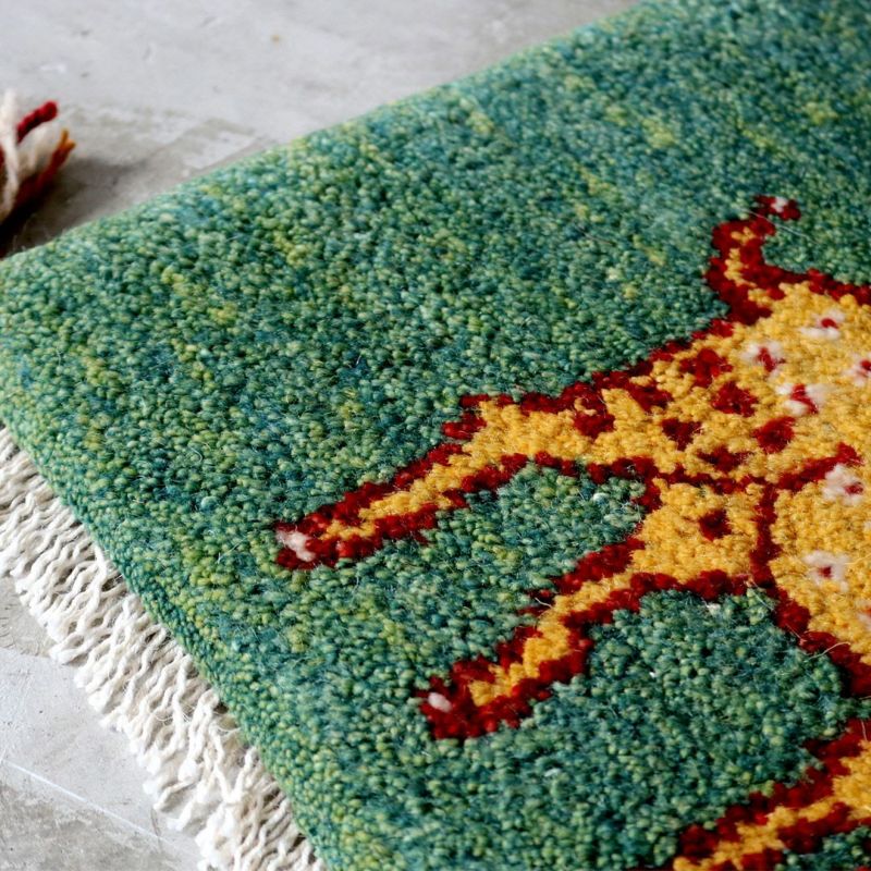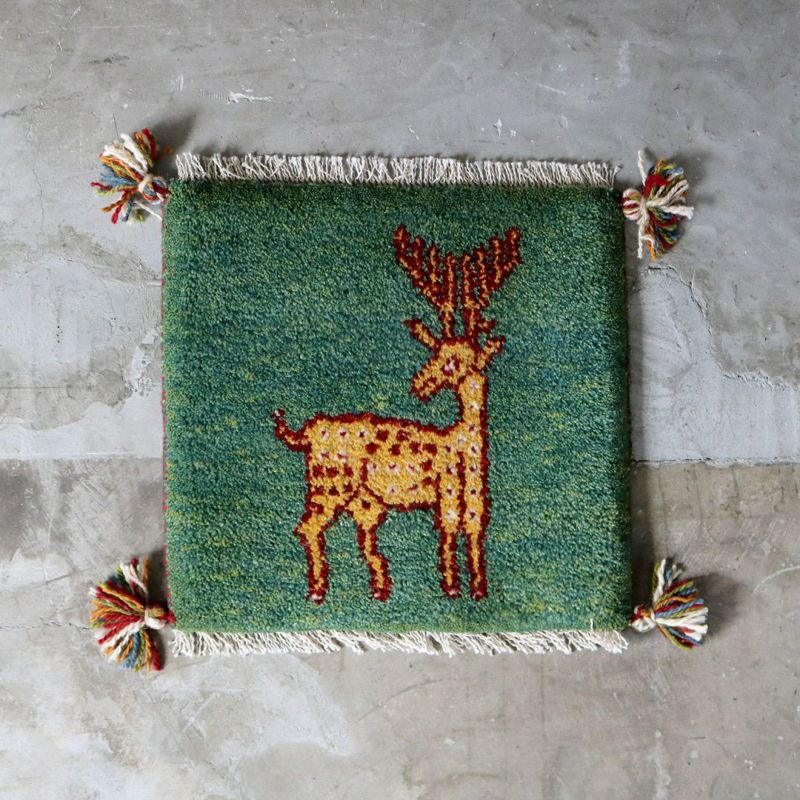遊牧民の暮らしの道具として育まれてきた「ギャッベ」。飼っている羊の毛を刈り、糸を紡ぎ、織りあげるという手法は、今も大切な文化として受け継がれており、同じものが存在しない世界にひとつの絨毯です。こちらは通称「チェアマット」ととも呼ばれる、椅子の座面にぴったりの座布団サイズ。鮮やかなグリーンを下地に描かれているのは、遊牧生活の中で目にするシカ。手仕事を感じる風合い、どこか温かく懐かしい雰囲気のギャッベは、どんなインテリアにも合わせやすい万能のアイテムです。