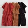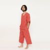 上着は首周り、肩幅・身幅・アームホールは広くとってあるので、体型を選ばすゆったりと着られます。パンツはワイドなシルエットの8分丈。リラックスしたお部屋着として、涼しげな素材は外出時でも快適にすごしていただけます。