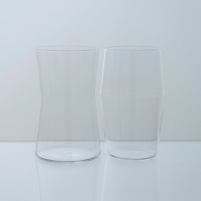一見バラバラの形に見えるグラスを隣同士並べると輪郭が綺麗に重なりあいます。その姿はお互いに支えあっているかのような、持ちつ持たれつな見た目。