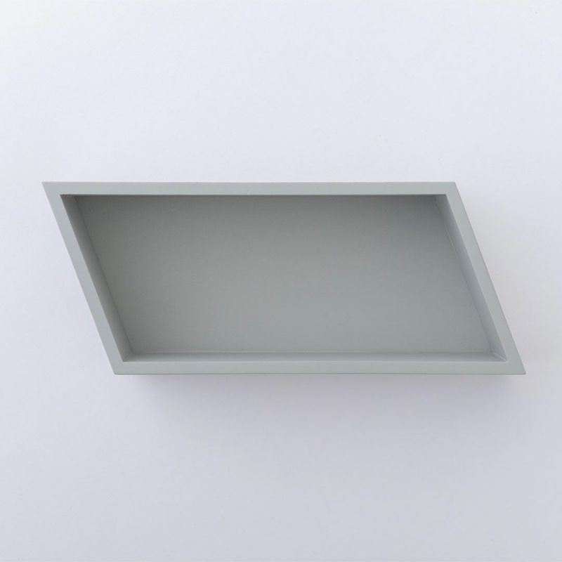 上から見ると、平行四辺形の形状は、目に留まりながらも主張し過ぎない絶妙なバランス。パースを崩すことで、本来直角に見えるはずの角物に違和感を与え、どこか抽象的な印象に。
