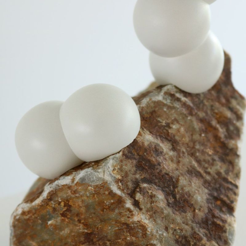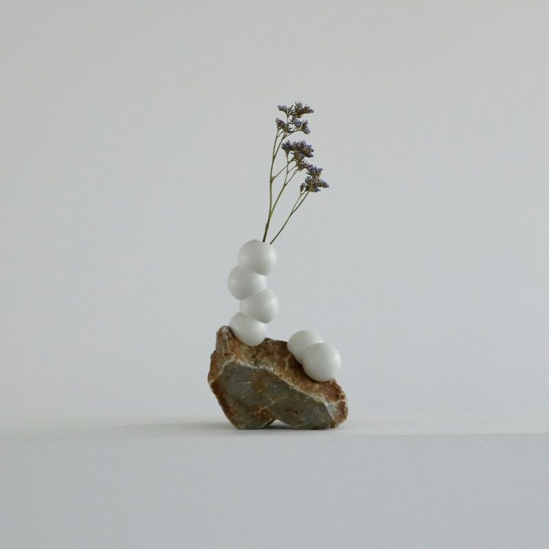 石と花の間に不思議な人工物が挟まった、新しい魅力を感じるプロダクト。3Dプリンタで出力された樹脂部分は接着されておらず、石の表面のでこぼこにぴったりと合うようになっています。簡単に外すことができ、またピッタリと石に寄生します。