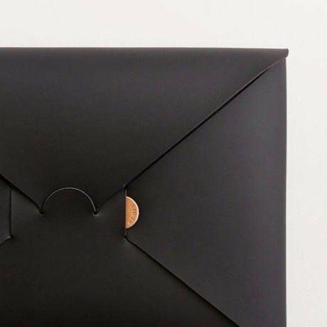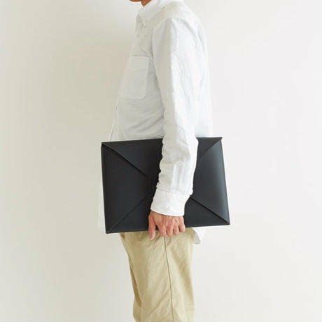 一枚のパーツを縫製せずに折り込んで組み立てたシンプルな構造のクラッチバッグ。
