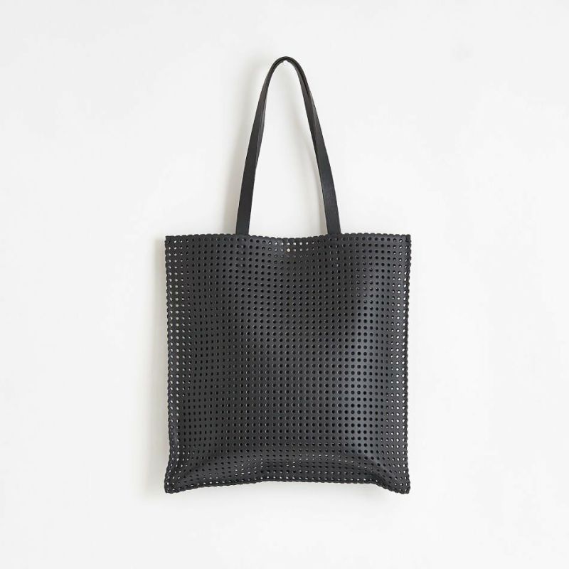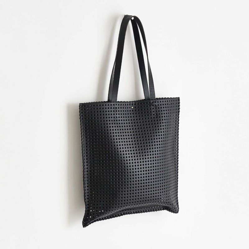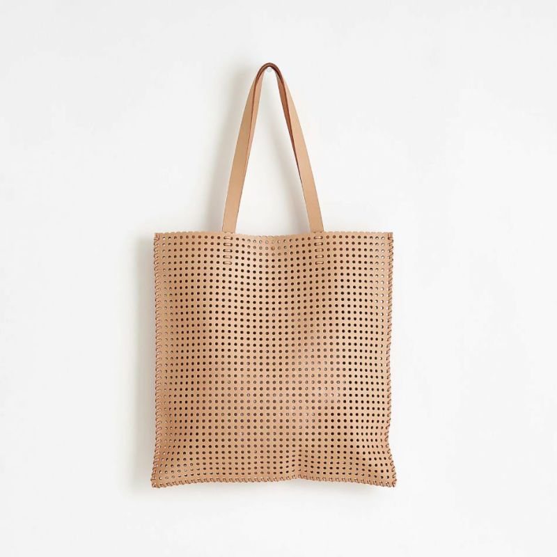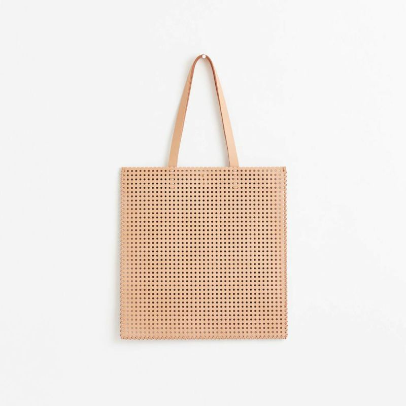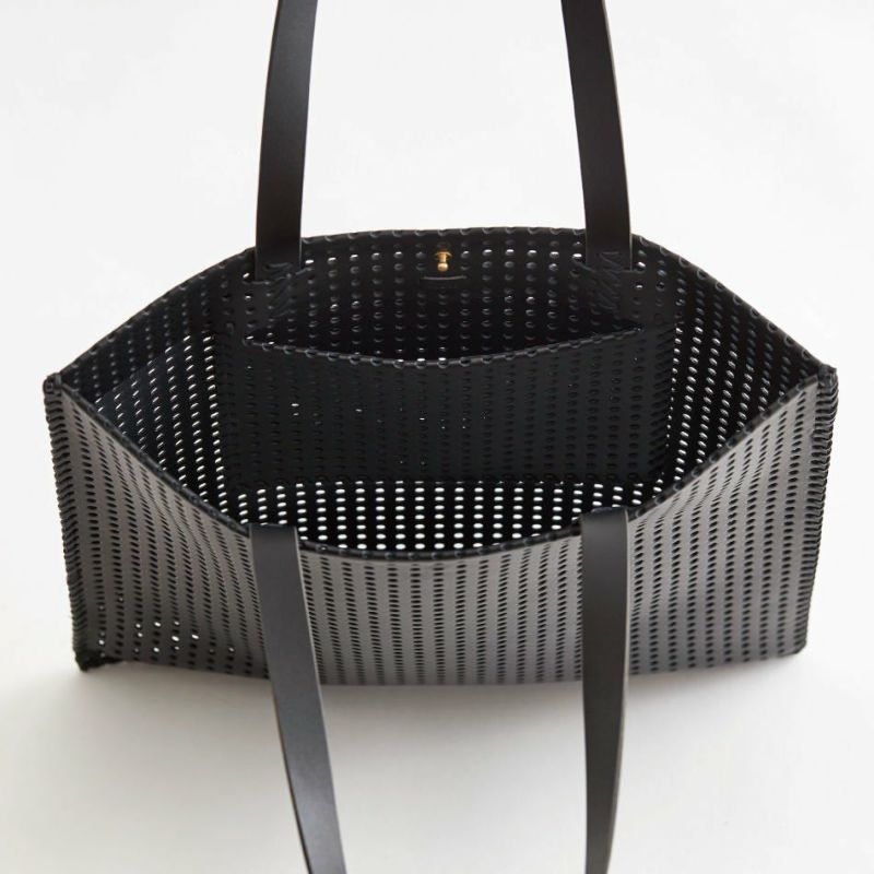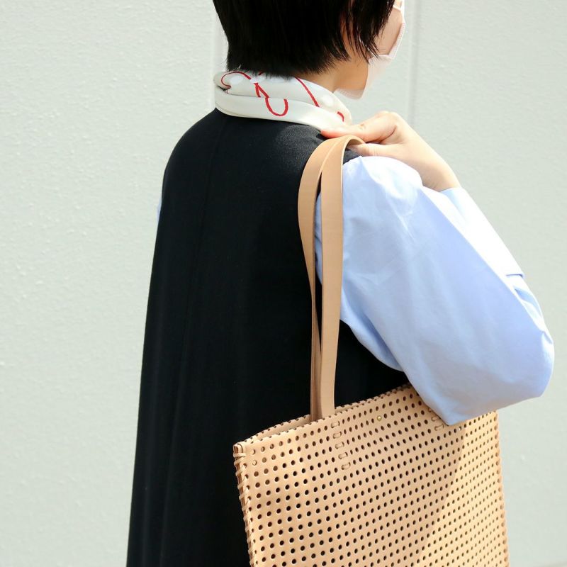 籠細工から着想を得た"KAGO"シリーズのフラットバッグ。普遍的に使えるような形にするために、いろいろな民芸のカゴを参考に試作を重ねて完成しました。