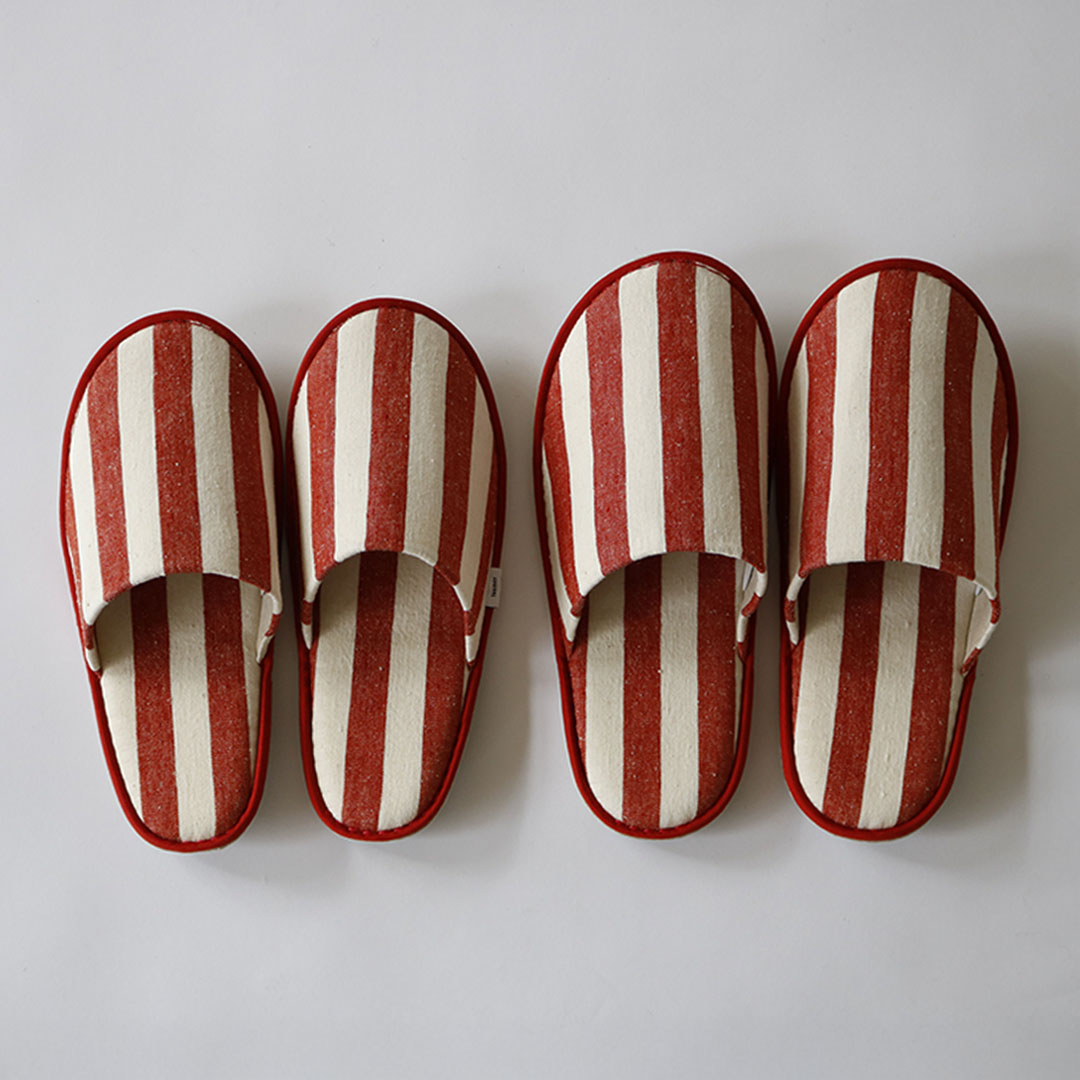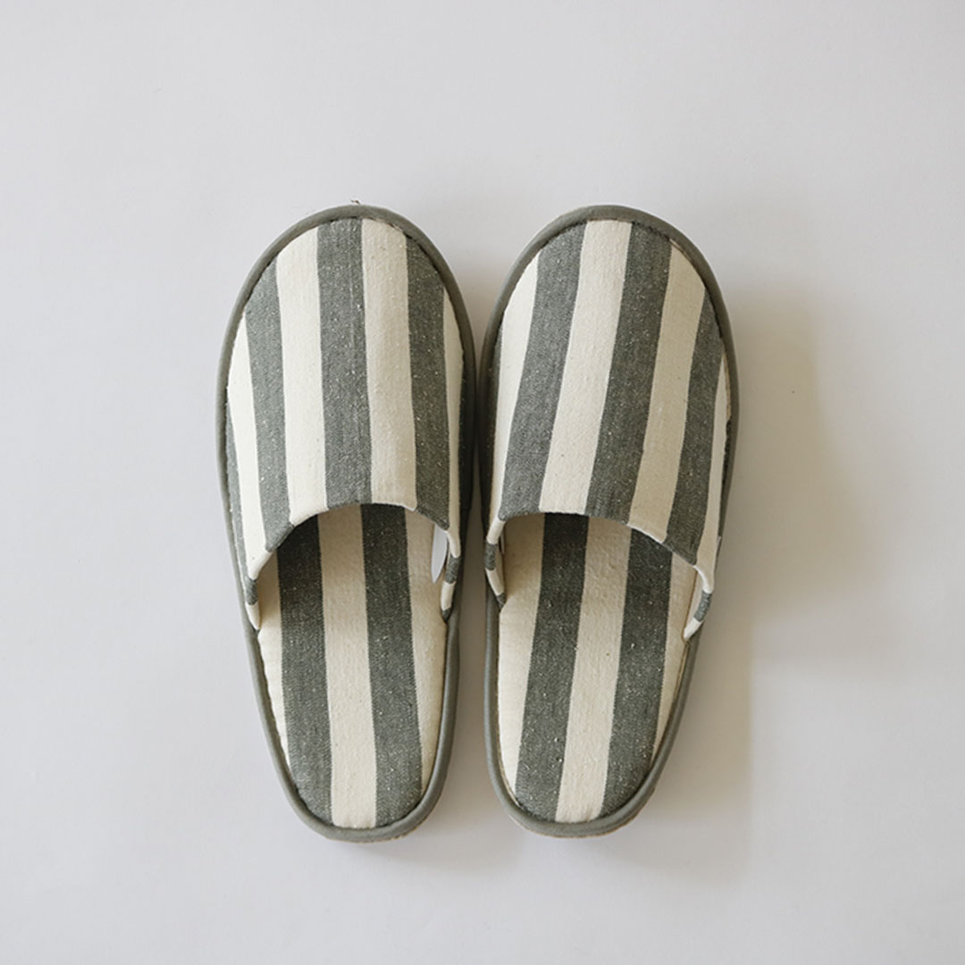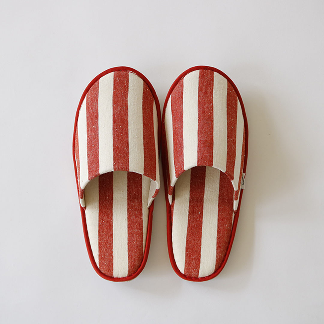 生成りのベースに太めのストライプが映え、軽やかさと存在感を併せ持っています。暮らしの風景に彩りを添えながらも自然と溶け込むようなスリッパです。