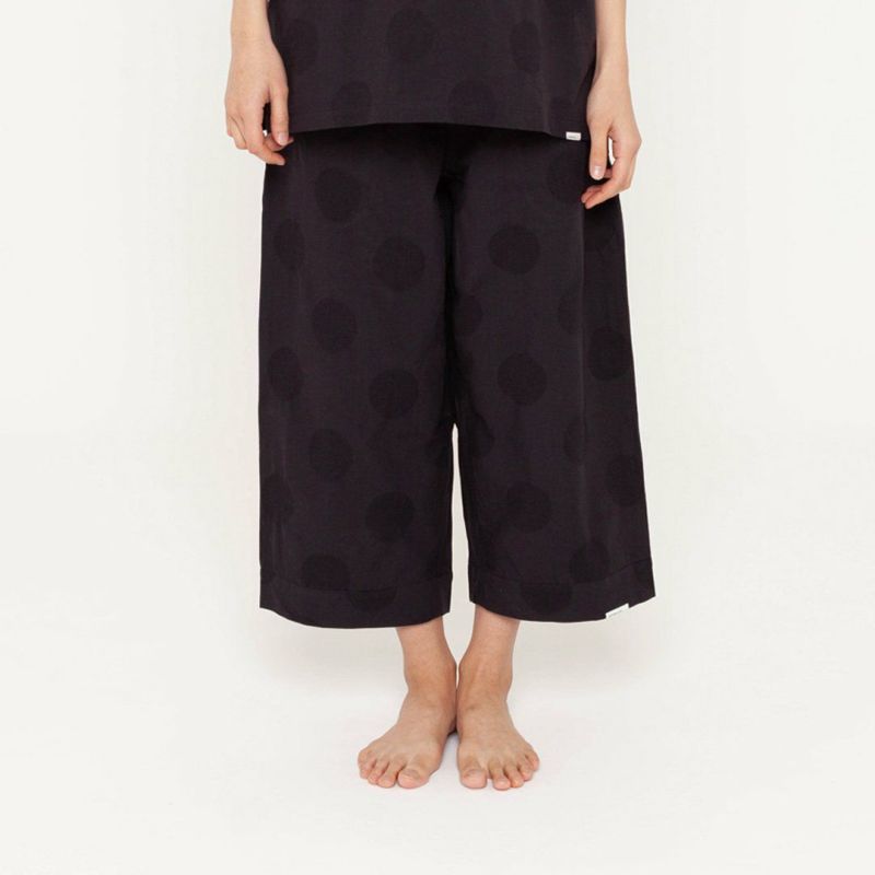 上着は首周り、肩幅・身幅・アームホールは広くとってあるので、体型を選ばすゆったりと着られます。パンツはワイドなシルエットの8分丈。リラックスしたお部屋着として、涼しげな素材は外出時でも快適にすごしていただけます。