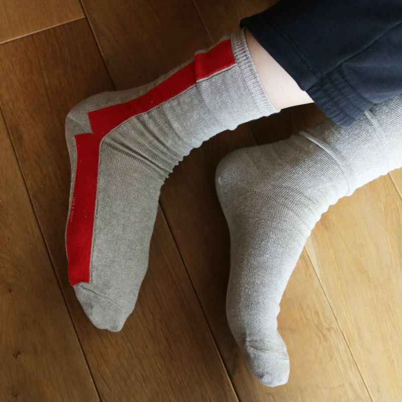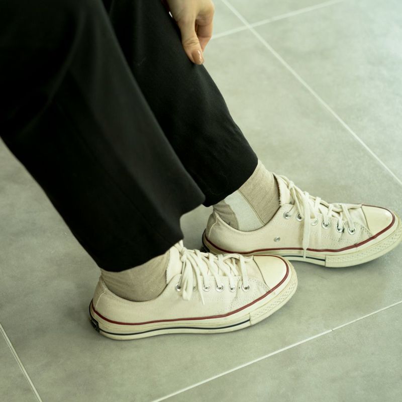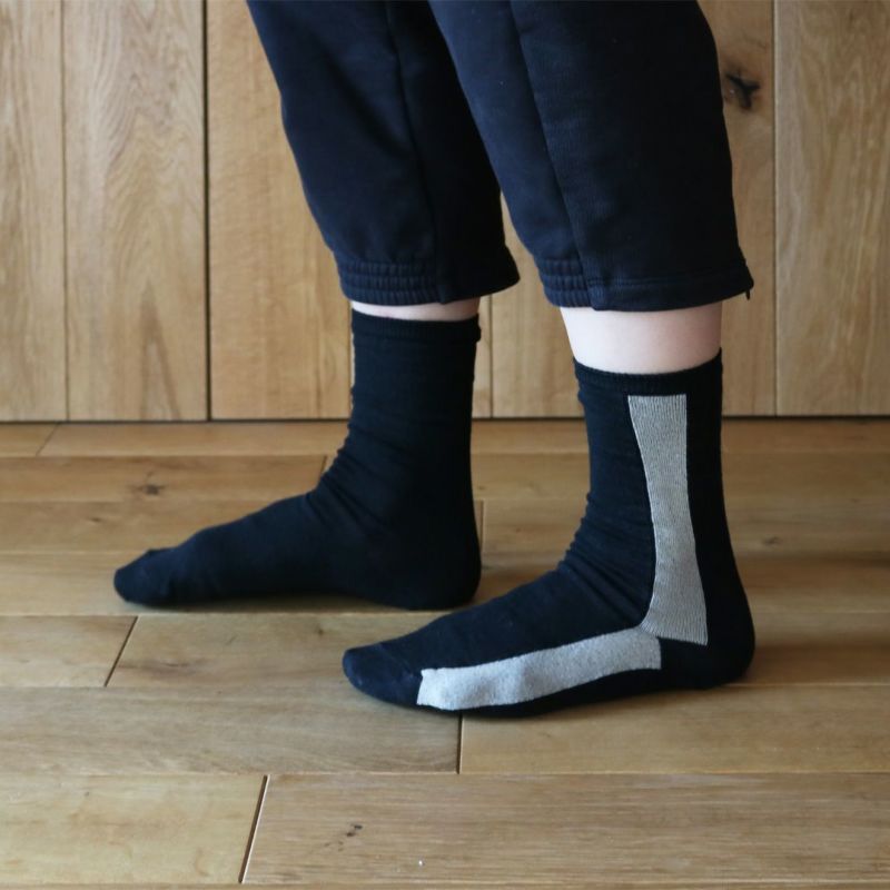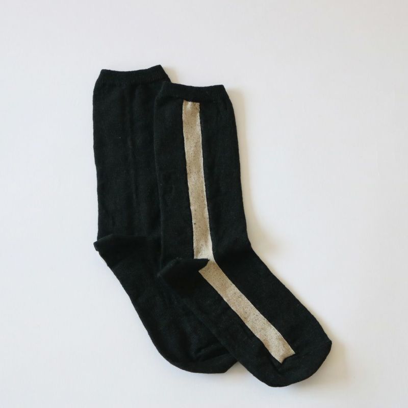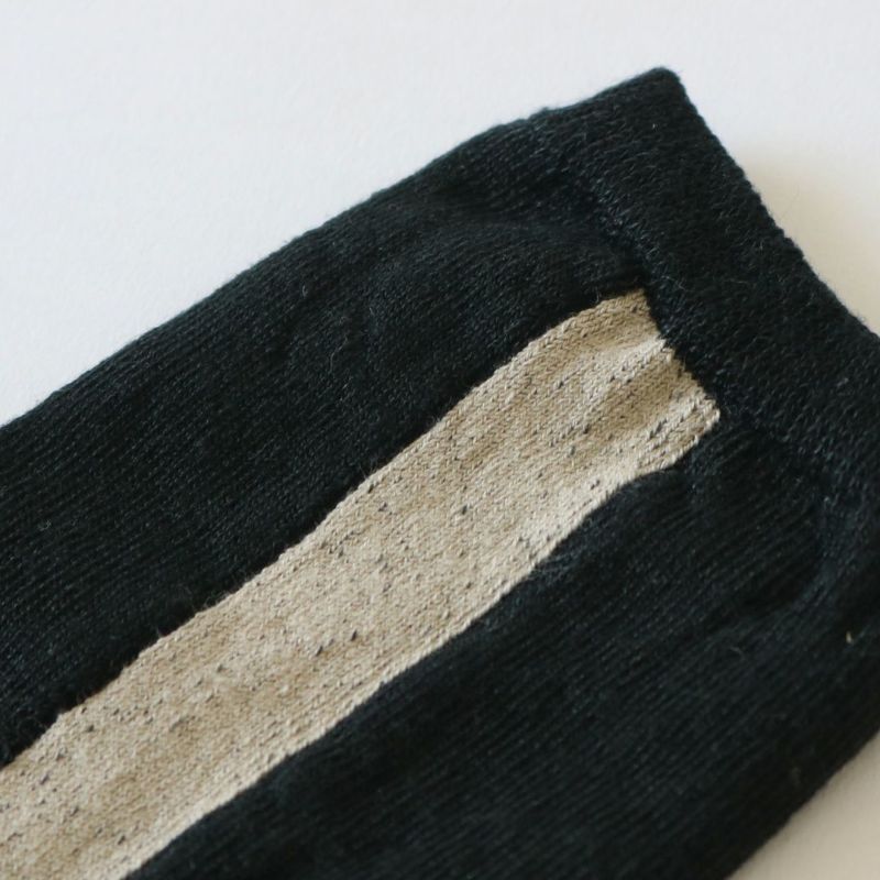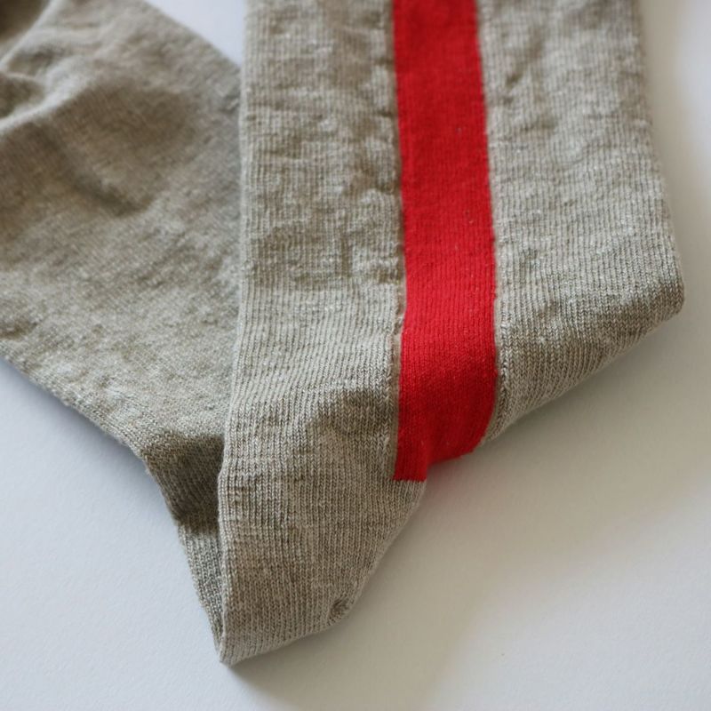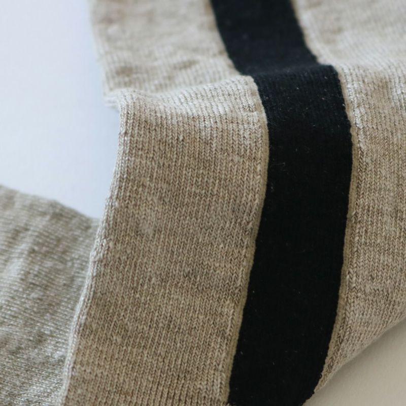 またカビや菌の繁殖を抑える抗菌性もあるので、高温多湿な季節を快適に過ごすことができます。個性のあるリネンの表情とギザ綿の柔らかい光沢のライン靴下は他にはない一足。