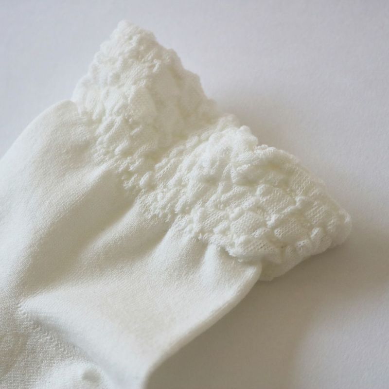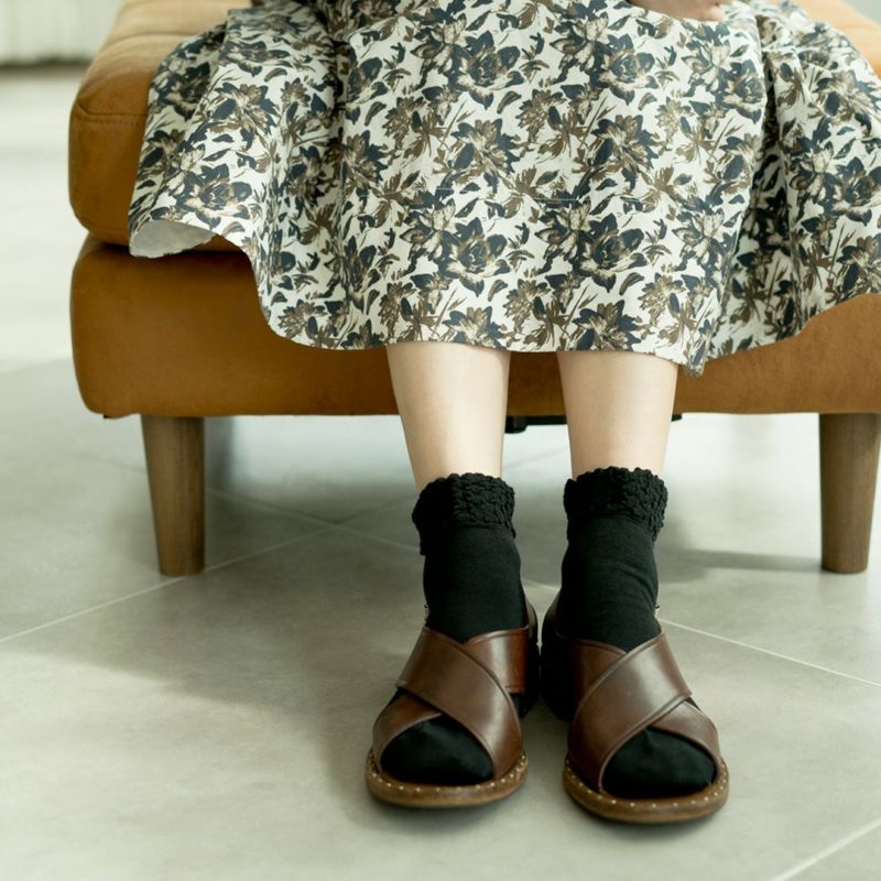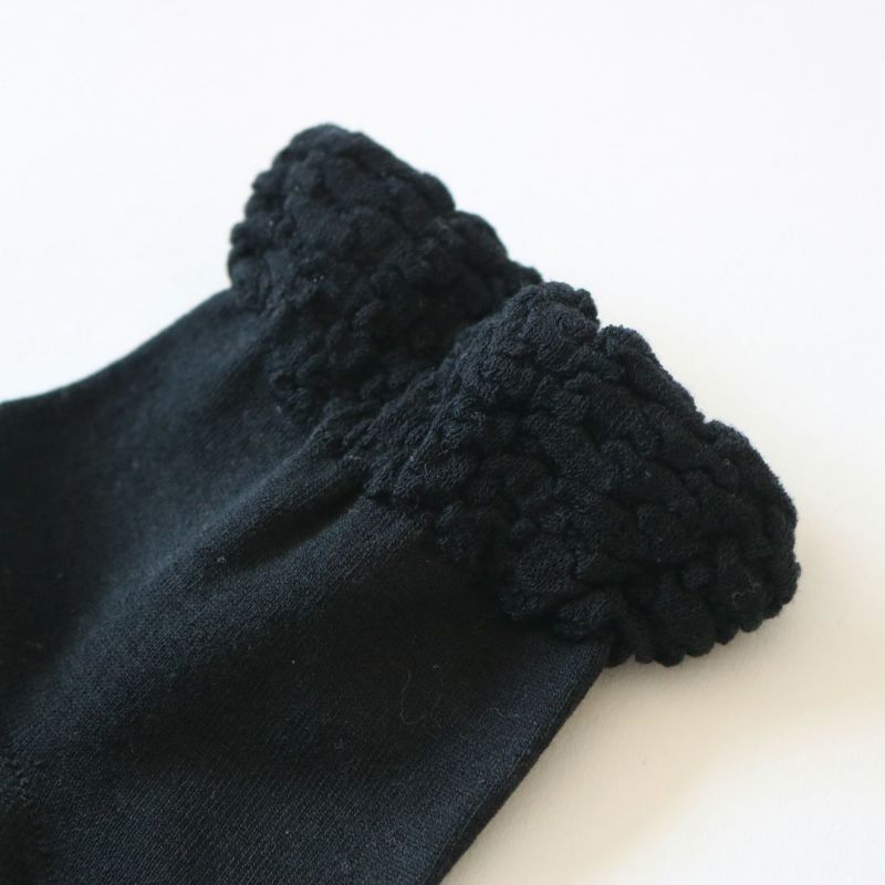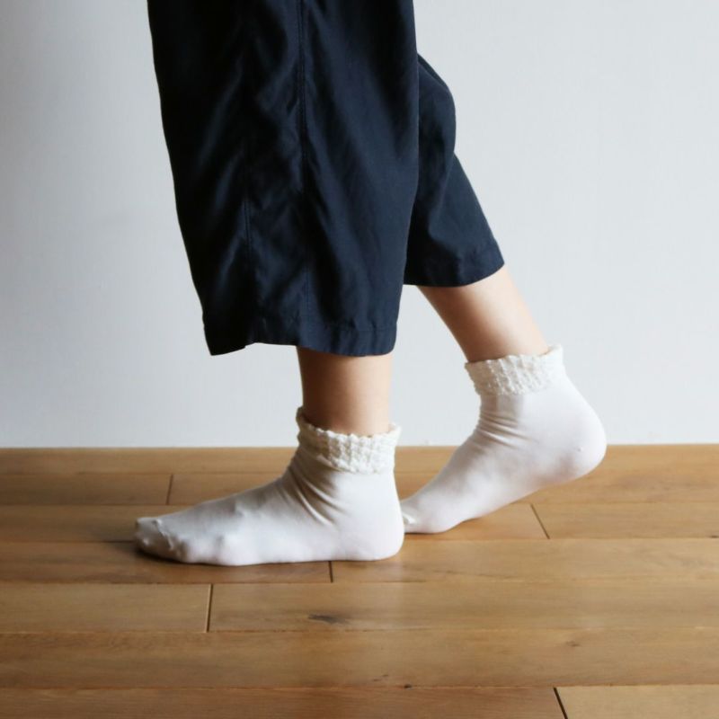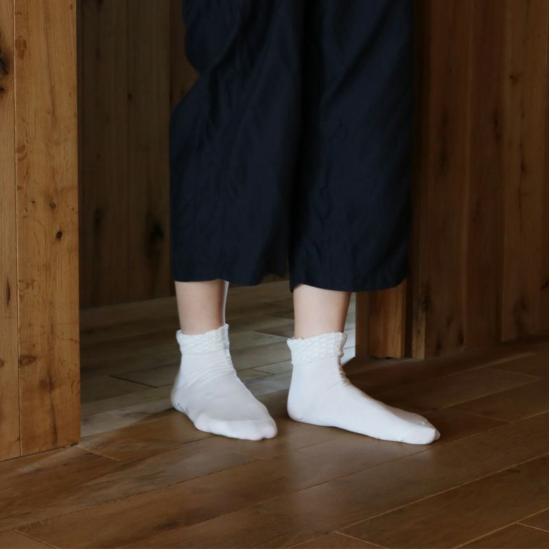 スーピマ綿の中でも細い糸選びハイゲージ機で編み立てる事で、表面はさらっと滑らか、履くとしっかりとした生地感を感じて頂けます。繊細な見た目とは裏腹に美しさを長く保ってくれる心強い一足です。