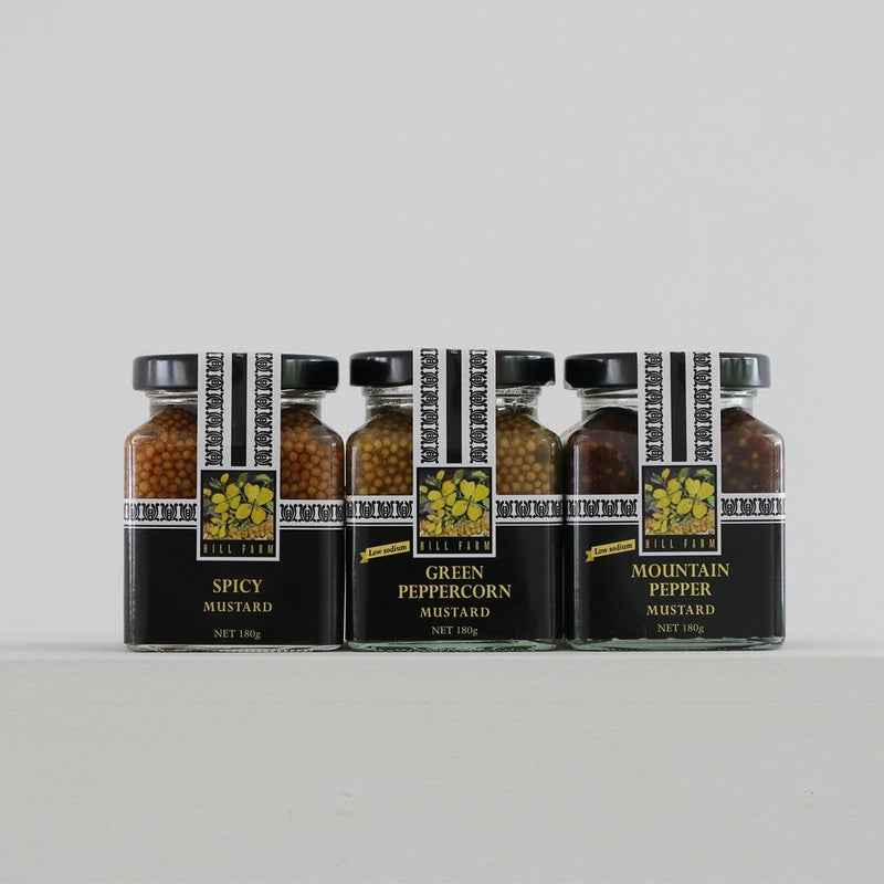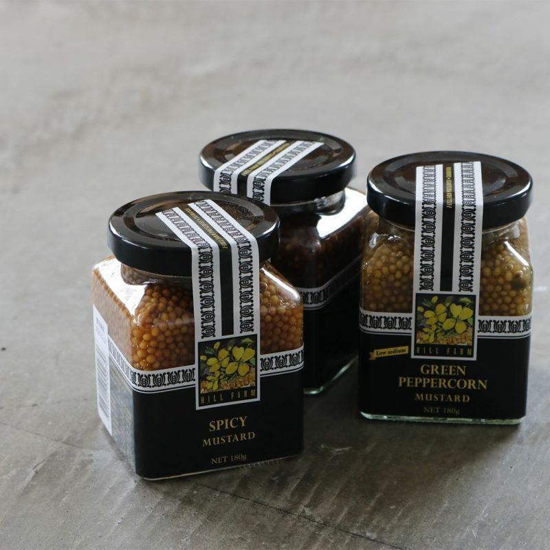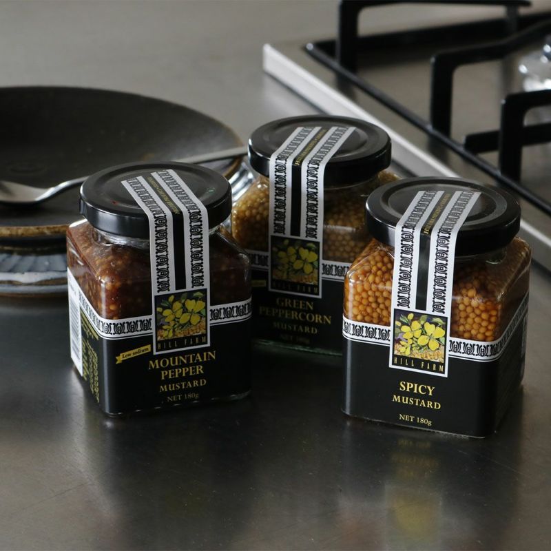 HILL FARMのマスタードは、「香」「風味」「食感」ともに一般的なマスタードの粋を越えた一品として評されています。一部香辛料などを除きヴィネガーや調味料など全てをタスマニア産の原料で作られており、保存料、香料など一切使用しないプレミアムな商品を小規模で生産しています。